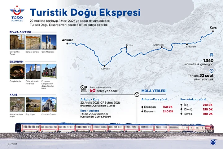 Turistik Doğu Ekspresi, 2025-2026 kış sezonu seferlerine 22 Aralık 2025’te başlıyor. Kış turizminin parlayan yıldızı haline gelen rotadaki seferler için biletler haftalar öncesinden tükendi.