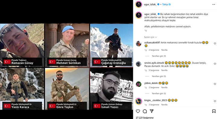 Paylaşımı sırasında şehit düşen vatan evlatlarının isimleri ve fotoğraflarını yayınlayan Uğur Işılak'ın paylaşımı sosyal medyada duygu dolu anlar yaşattı.