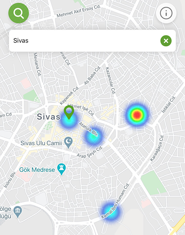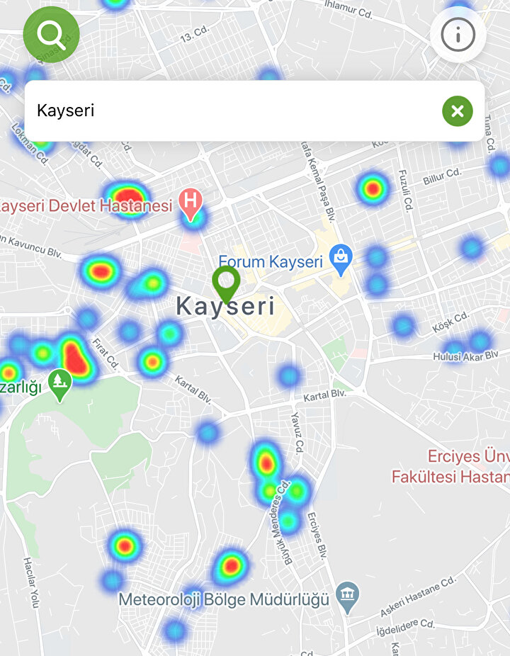 Kayseri'nin koronavirüs yoğunluk haritası.