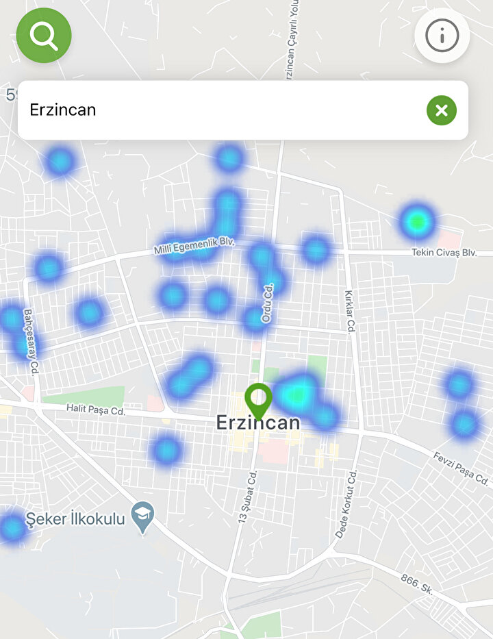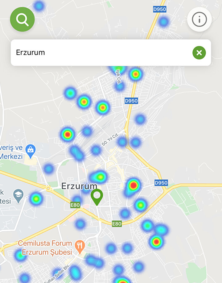 Erzincan'ın koronavirüs yoğunluk haritası.