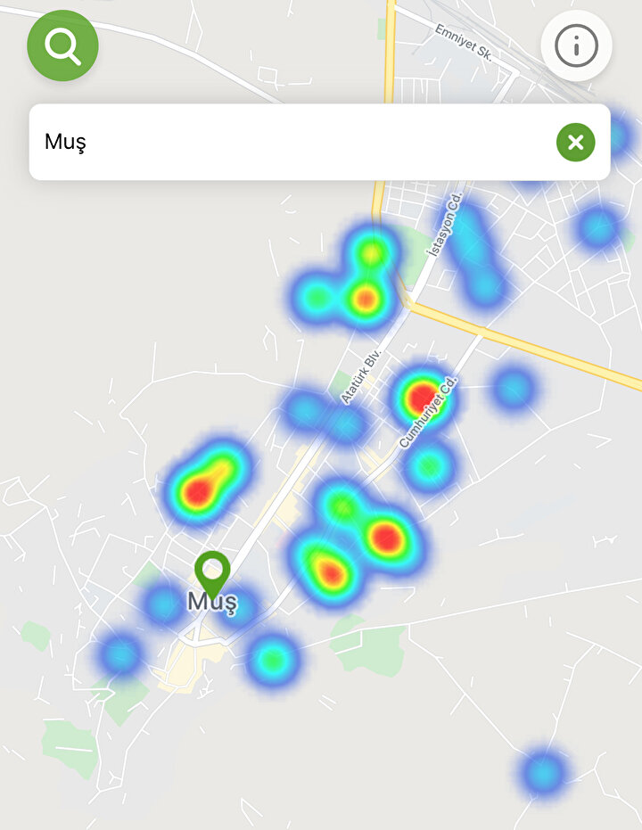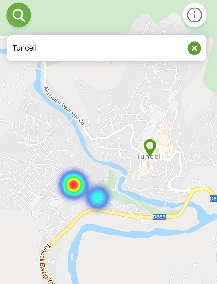 Tunceli'nin koronavirüs yoğunluk haritası.