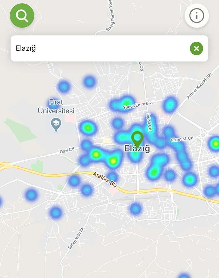 Elazığ'ın koronavirüs yoğunluk haritası.