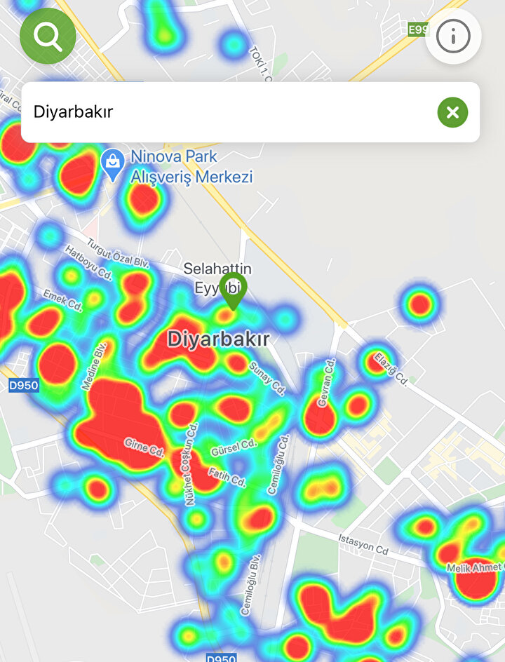Diyarbakır'ın koronavirüs yoğunluk haritası.