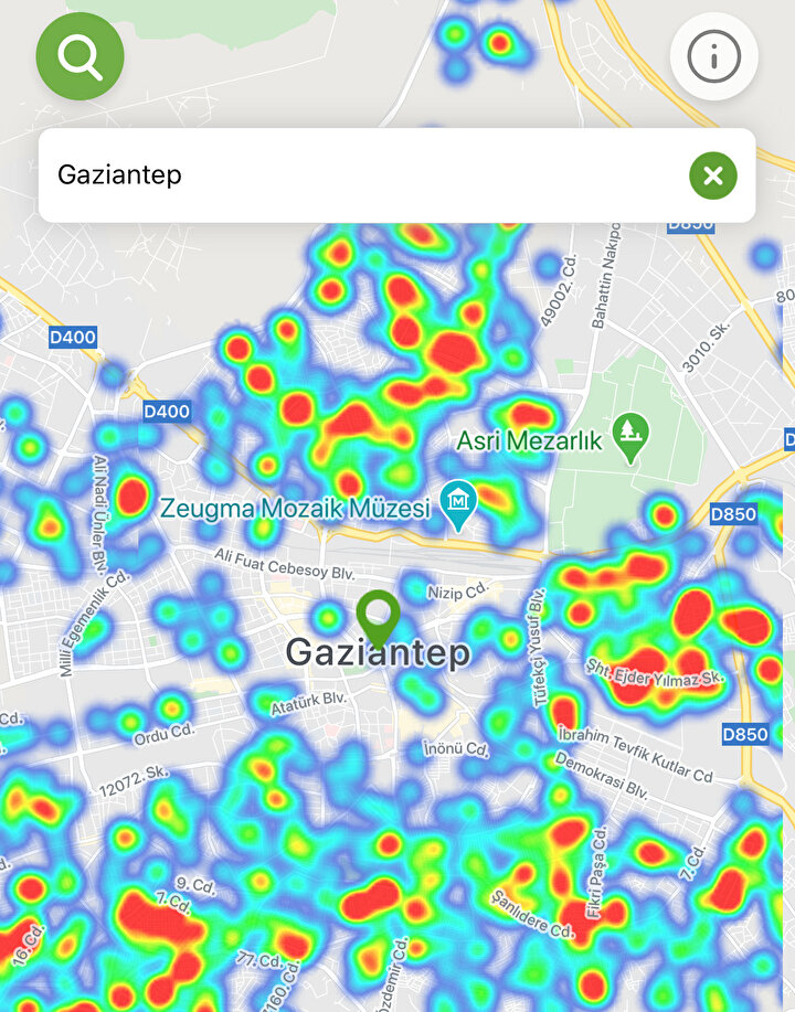Gaziantep'in koronavirüs yoğunluk haritası.