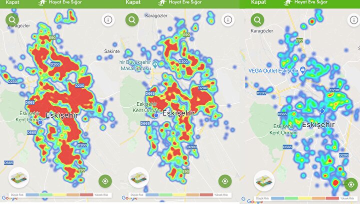 Pozitif vakalardaki düşüş Sağlık Bakanlığı'nın HES mobil uygulamasındaki risk haritasına da yansıdı. Son 1 aylık kısıtlamalardan önce kentin neredeyse tamamı 'yüksek risk' anlamına gelen kırmızıyla kaplıyken, kısıtlamalar sonrasında riskli bölgeler yeşile döndü. Aylar sonra ilk kez ise harita üzerindeki bazı alanlarda 'düşük risk' anlamına gelen mavi alanlar oluştu.
