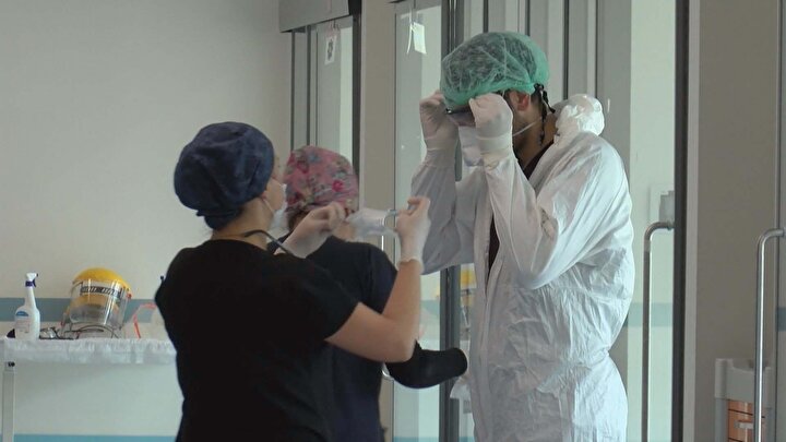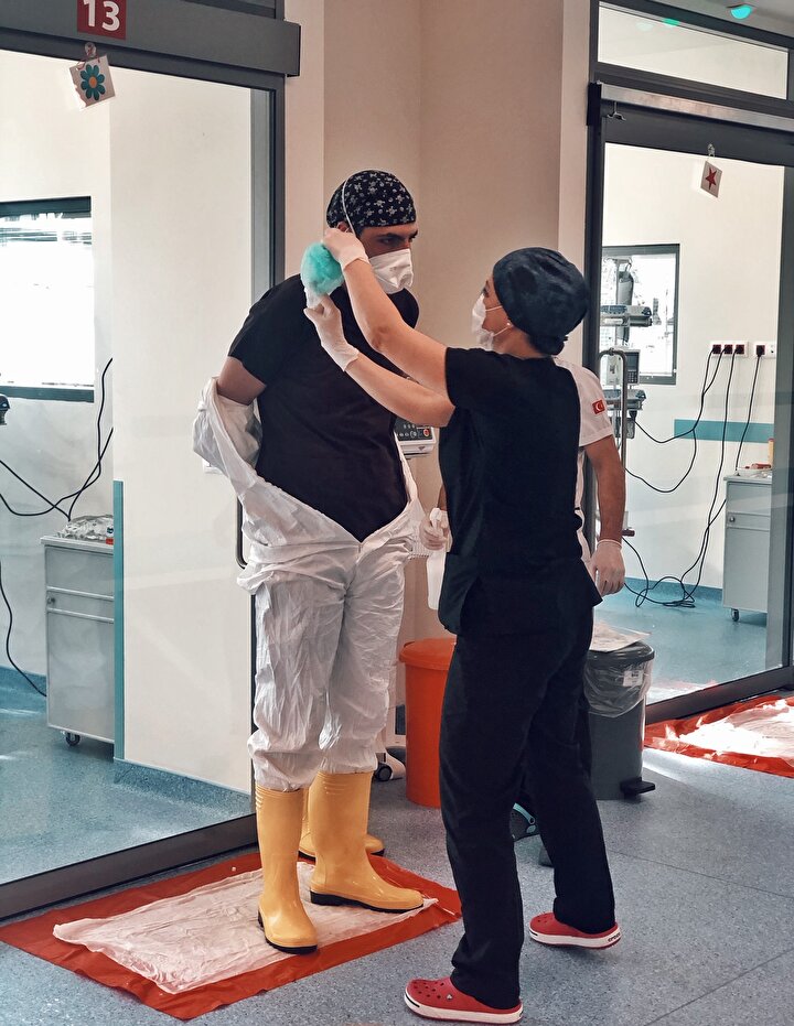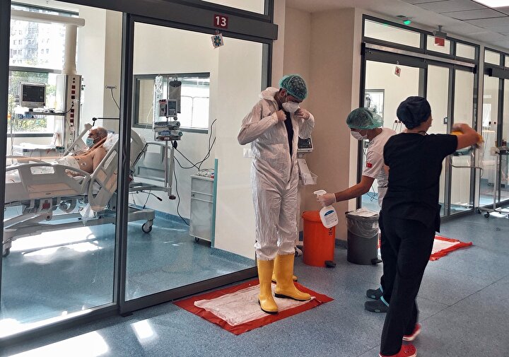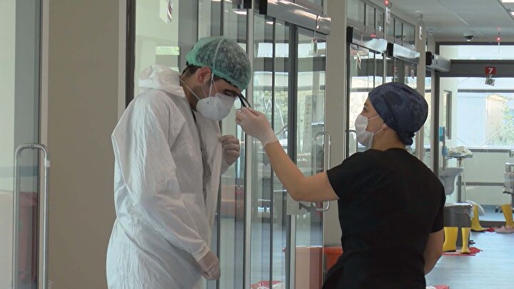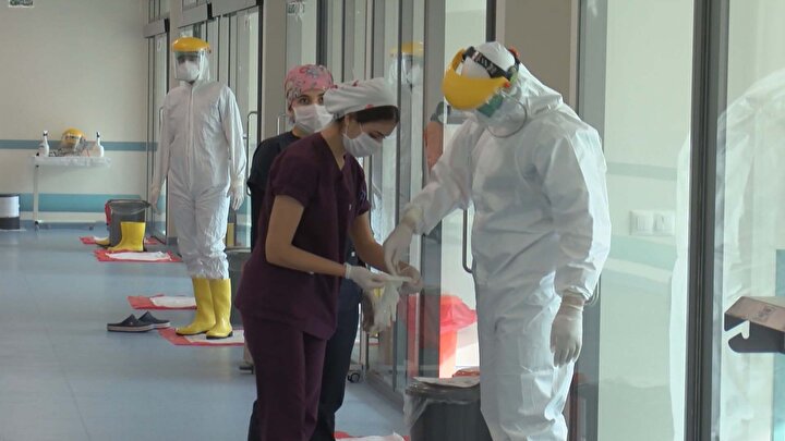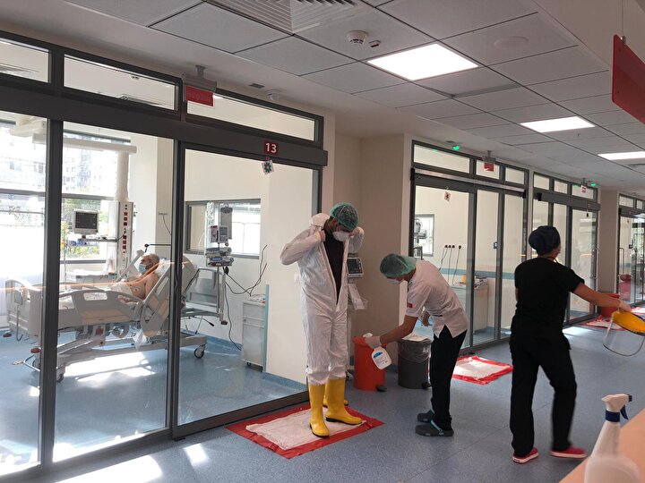 Vücutlarında açıkta kalan herhangi bir nokta kalmadığından emin olan sağlık çalışanları, her bir hasta ile özenle ilgileniyor. Tedavilerini tamamladıktan sonra odadan çıktıklarında ise hiçbir yere dokunmadan, arkadaşlarının yardımıyla dezenfekte olarak, koruyucu ekipmanlarını çıkarıyorlar.