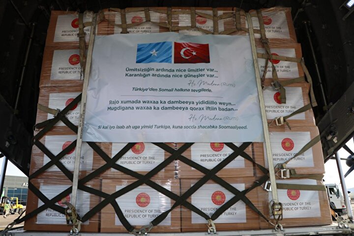Üzerinde Cumhurbaşkanlığı forsu, Türkiye ve Somali bayraklarının yanı sıra Türkçe ve Somalice olarak Mevlana'nın, Ümitsizliğin ardında nice ümitler var. Karanlığın ardında nice güneşler var. sözlerine yer verildi.