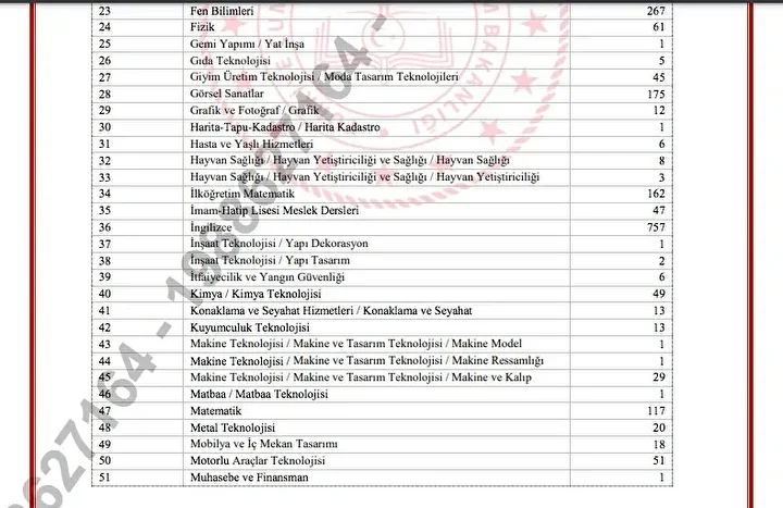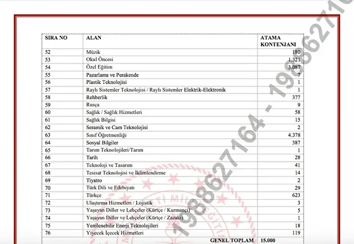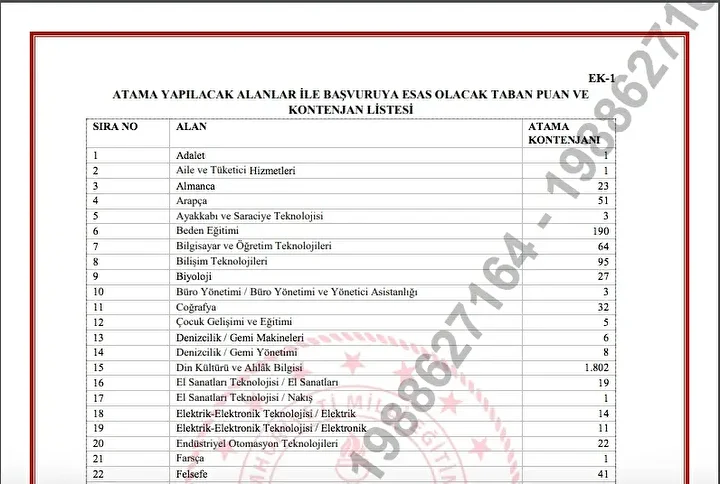 ÖĞRETMEN ATAMA YAPILACAK ALANLAR İLE BAŞVURUYA ESAS OLACAK TABAN PUAN VE KONTENJAN LİSTESİ