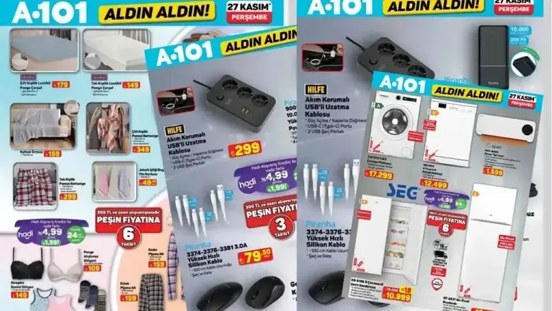 A101 aktüel ürünler kataloğu belli oldu. A101 27 Kasım 2025 Aktüel Ürünler Kataloğu, geniş ürün yelpazesiyle müşterilerin ilgisini çekiyor. Samsung 70" UHD smart Tv 38.999 TL, çamaşır makinesi 17.299 TL, 150 CC benzinli motosiklet 99.990 TL, kablosuz mouse 89,50 TL, süzme peynir 500 G 99,50 TL, toz deterjan 9 KG 399 TL ile satışa sunulacak. Peki A101 afişi yeni ürünleri neler? İşte 27 Kasım 2025 A101 indirim kataloğu tam liste.