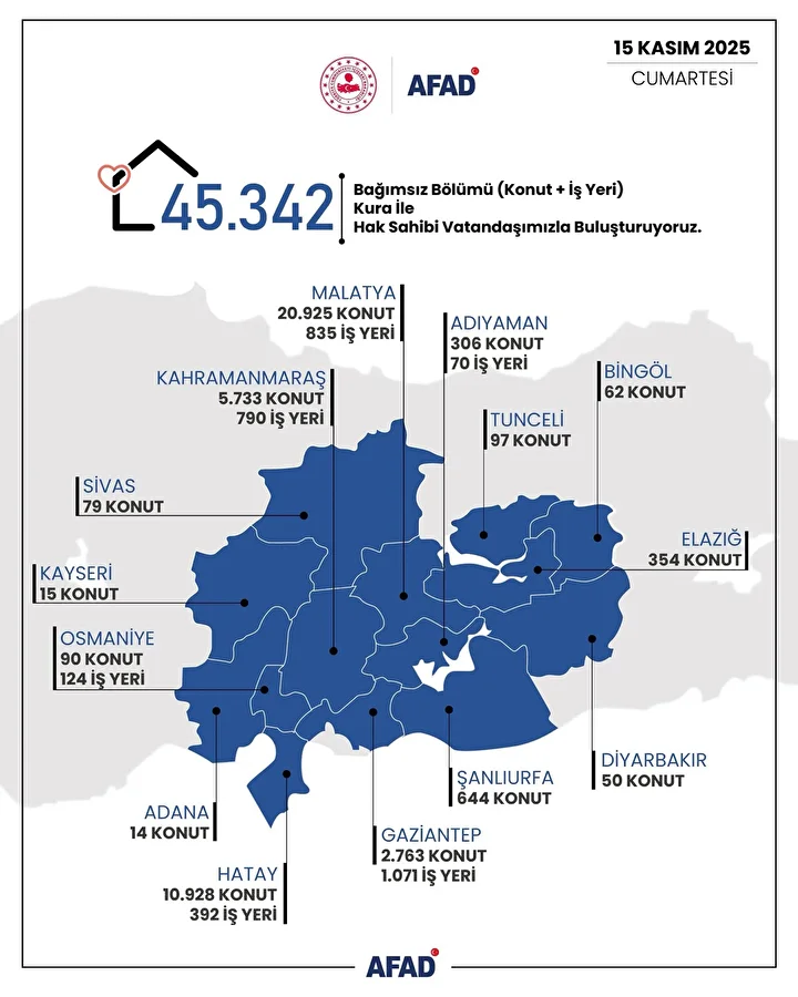 6 Şubat 2023 tarihinde meydana gelen ve "Asrın Felaketi" olarak adlandırılan depremler, Türkiye’nin dört bir yanında büyük yıkımlara yol açtı. Ancak afet sonrası Türkiye, hızla toparlanmak için önemli adımlar attı. Türkiye Afet Sonrası İyileştirme Planı (TASİP) kapsamında, depremzedelere yönelik başlatılan konut yapım çalışmaları tüm hızıyla devam ediyor. Adana, Adıyaman, Bingöl, Diyarbakır, Elazığ, Gaziantep, Hatay, Kahramanmaraş, Kayseri, Malatya, Osmaniye, Sivas, Şanlıurfa ve Tunceli illerinde yapımı tamamlanan 45 bin 342 deprem konutları 15 Kasım Cumartesi günü Cumhurbaşkanı Erdoğan'ın katılımıyla kura çekimi ile hak sahiplerine teslim edilecek. En yüksek teslimat 21.760 ile Malatya için yapılacak. Kura çekimi AFAD'ın resmi YouTube hesabı üzerinden canlı olarak izlenebilecek. 45 bin deprem konutları kura çekimi kesin sonuçları ise e-Devlet'in AFAD sayfası üzerinden ilan edilecek.