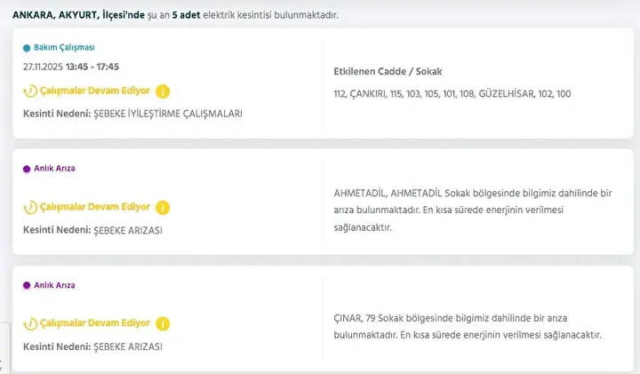 Ankara’da 27 Kasım 2025 Perşembe günü çeşitli ilçelerde planlı elektrik kesintileri gerçekleştirilecek. Başkent EDAŞ'ın duyurduğu bilgilere göre, bakım ve onarım çalışmaları kapsamında şehir genelinde belirli bölgelerde elektrikler belirli saatlerde kesintiye uğrayacak. Hangi ilçelerde kesinti olacağı ve elektriğin ne zaman geleceği merak konusu olurken, vatandaşlar detayları araştırıyor. İşte Başkent EDAŞ'ın sorgulama ekranı ile planlı elektrik kesintisi duyuruları.