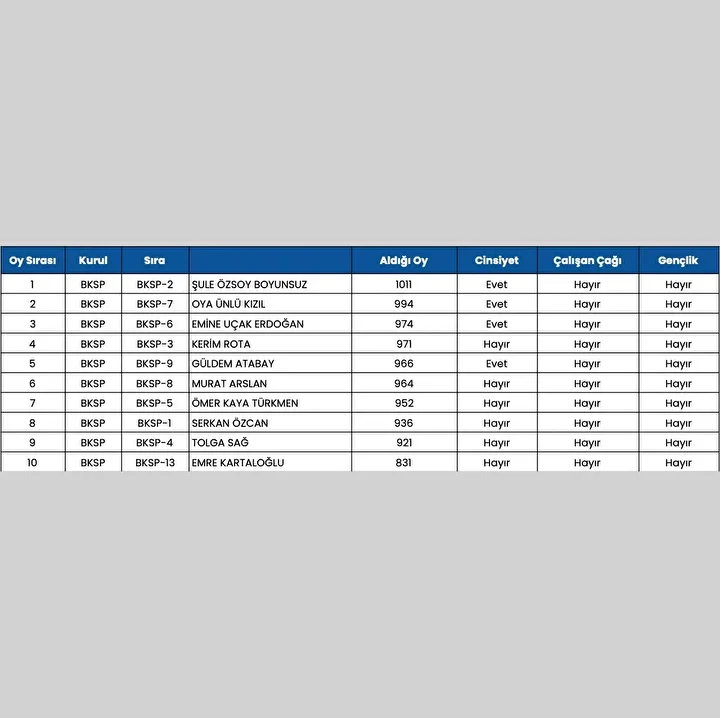 "Süreyya Öneş Derici, Barış Övgün, Turgay Özcan, Suat Özçağdaş, Tuğçe Hilal Özkan, Engin Özkoç, Uygar Parçal, Evrim Rızvanoğlu, Selin Sayek Böke, Baran Seyhan, Polat Şaroğlu, Bihlun Tamaylıgil, Namık Tan, Mahmut Tanal, Sezgin Tanrıkulu, Gamze Taşcıer, Canan Taşer, Melisa Uğraş, Salih Uzun, Pınar Uzun Okakın, İsmail Atakan Ünver, Ozan Varal, Mehmet Necati Yağcı, Deniz Yavuzyılmaz, Emre Yılmaz, Deniz Yücel, Mahir Yüksel, Gökan Zeybek, Erhan Adem, Zeliha Aksaz Şahbaz, Nurhayat Altaca Kayışoğlu, Cavit Arı, Ednan Arslan, Baki Aydöner, Ensar Aytekin, Yankı Bağcıoğlu, Murat Bakan, Saniye Barut, Ozan Bingöl, Burhanettin Bulut, İlhan Cihaner, Sercan Çığgın, Gül Çiftci, Cansel Çiftçi, Nihat Dağ, Gülşah Deniz Atalar, Bedirhan Berk Doğru, Zeynel Emre, Hikmet Erbilgin, Bahadır Erdem, Asiye Ergül, Ali Abbas Ertürk, Ali Gökçek, Gökçe Gökçen, Kübra Gökdemir, Volkan Memduh Gültekin, Elif Leyla Gümüş, Nazan Güneysu, Ozan Işık, Uğurcan İrak, Özgür Karabat, Ulaş Karasu, Yalçın Kartepe, Ecevit Keleş, Sevgi Kılıç, Berk Kılıç, Sinem Kırçiçek, Önder Kurnaz, Burcu Mazıcıoğlu, Aylin Nazlıaka."