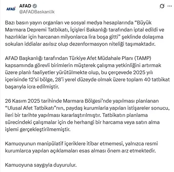 Cumhurbaşkanlığı İletişim Başkanlığı Dezenformasyonla Mücadele Merkezi (DMM), "Büyük Marmara Depremi Tatbikatı, İçişleri Bakanlığı tarafından iptal edildi ve hazırlıklar için harcanan milyonlarca lira boşa gitti" iddialarının asılsız olduğunu bildirdi.