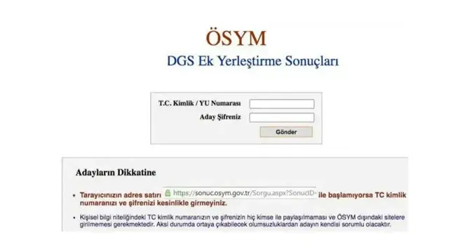DGS ek tercih sonucu sorgulama işlemleri sonuc.osym.gov.tr adresinden ilan edilecek. Adaylar mobil uygulama veya ÖSYM’nin resmi internet sitesi üzerinden sorgulama ekranına ulaşabilecek.