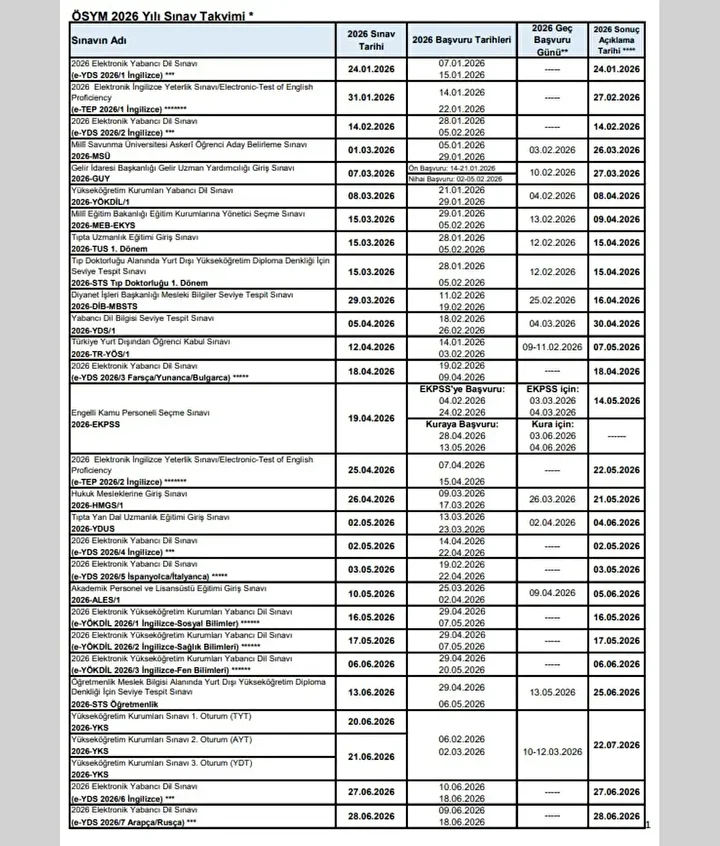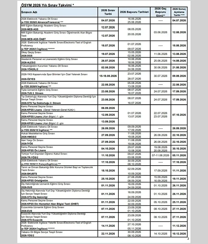 ÖSYM Başkanı Bayram Ali Ersoy sosyal medya X hesabından yaptığı açıklamada 2026 yılı sınav takvimini duyurdu. Yükseköğretim Kurumları Sınavı (YKS) 20-21 Haziran'da, Millî Savunma Üniversitesi Askerî Öğrenci Aday Belirleme Sınavı(MSÜ) 1 Mart’ta gerçekleştirilecek. ÖSYM sınav takvimine göre 2026 DHBT sınav, başvuru ve sonuç tarihleri de netleşti.