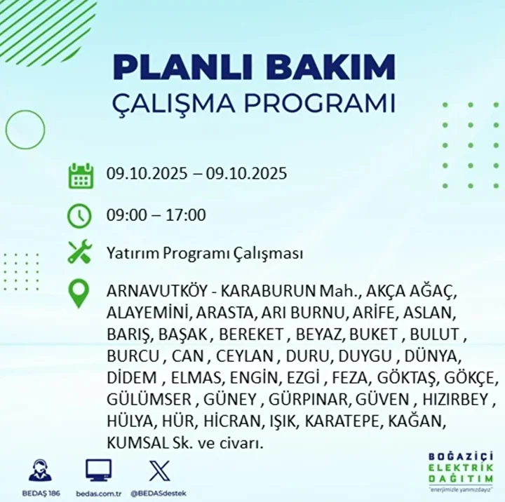 Boğaziçi Elektrik Dağıtım A.Ş tarafından yapılan duyuruya göre 9 Ekim Perşembe İstanbul'da farklı saat aralıklarında 21 ilçede elektrik kesintisi uygulanacak.