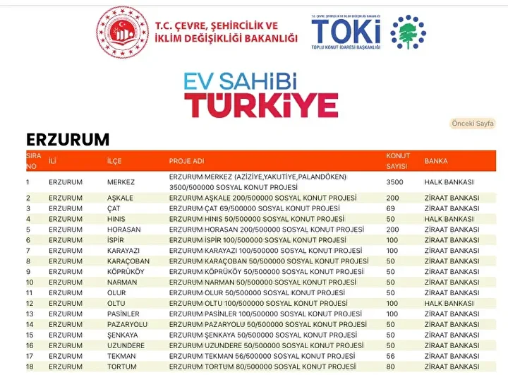 500 bin sosyal konut projesi çerçevesinde Erzurum’da Aziziye, Yakutiye, Palandöken, Aşkale, Çat, Hınıs, Horasan, İspir, Karayazı, Karaçoban, Köprüköy, Narman, Olur, Oltu, Pasinler, Pazaryolu, Şenkaya, Uzundere, Tekman ve Tortum ilçesine TOKİ konutları yapılacak.