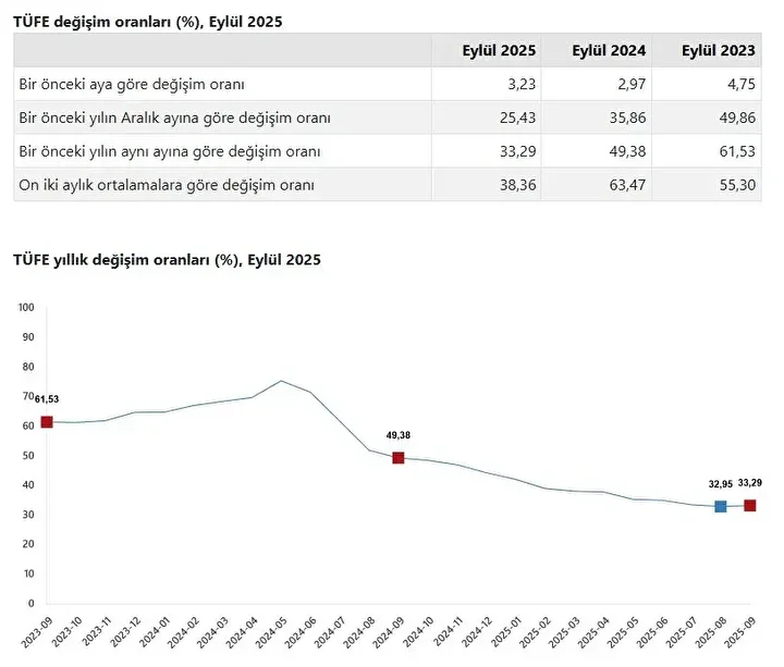 Türkiye İstatistik Kurumu (TÜİK), eylül ayı enflasyon rakamlarını açıkladı. Buna göre, eylül ayında enflasyon yüzde 3,23 olurken, yıllık enflasyon yüzde 33,29 olarak gerçekleşti. Temmuzda yüzde 2,06, ağustosta yüzde 2,04 artış gösteren enflasyon, üç aylık dönemde toplamda yüzde 7,5 oldu.