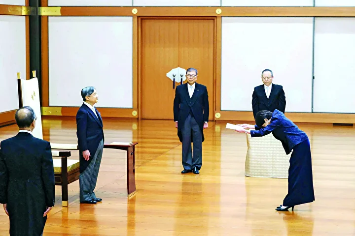 Tokyo’daki İmparatorluk Sarayı’ndaki görevlendirme töreninde, eski bir heavy metal grubu üyesi olduğu ortaya çıkan Japonya’nın yeni ve ilk kadın Başbakanı Sanae Takaichi ile İmparator Naruhito bir arada dururken, eski Başbakan Shigeru Ishiba onları izliyor. Taş giyen baş akıllanır sözüne Japonya’dan bir fragman. (AFP)