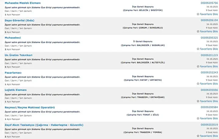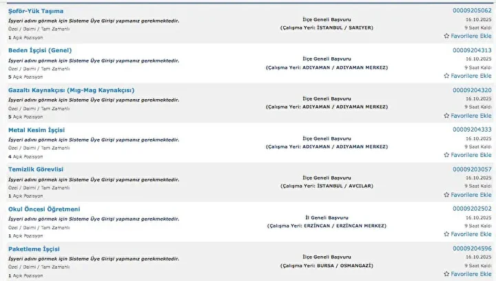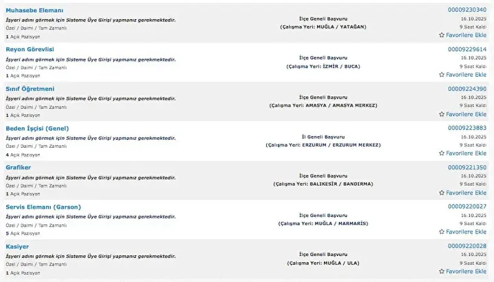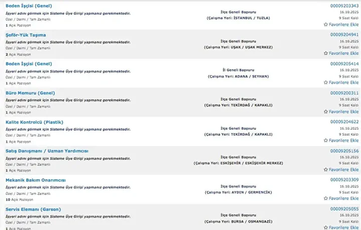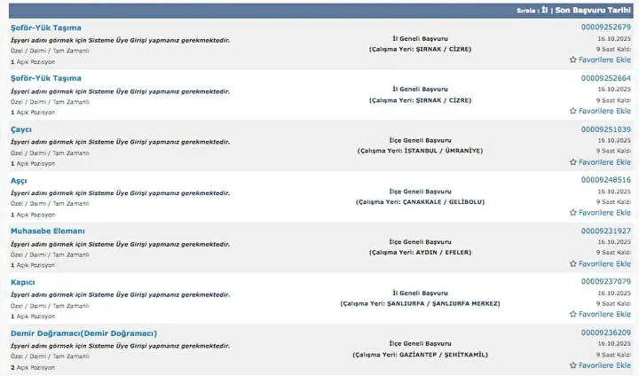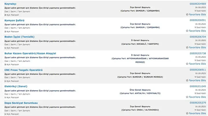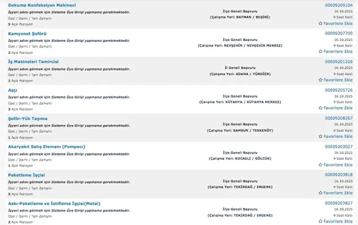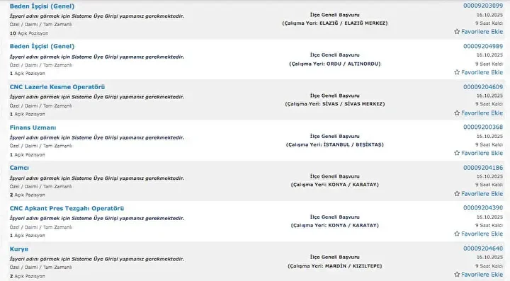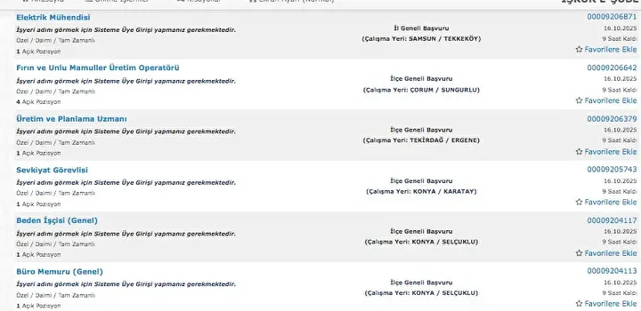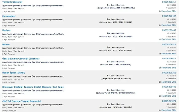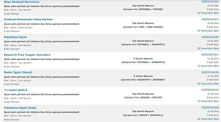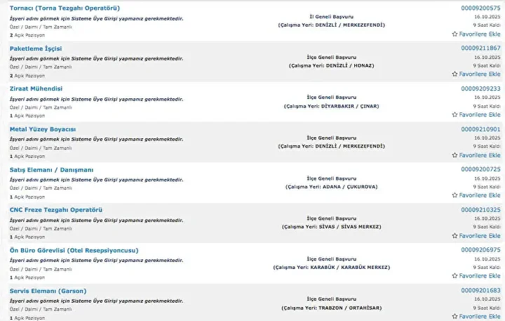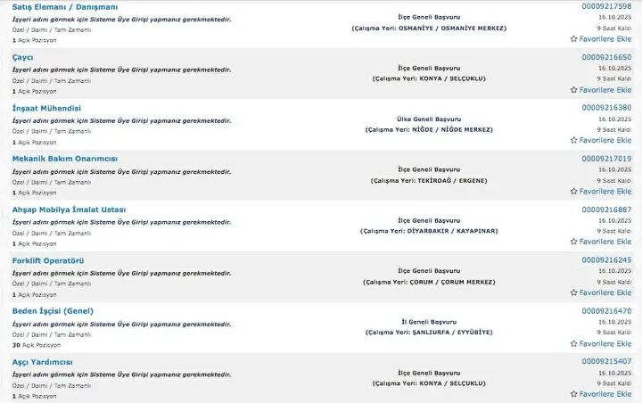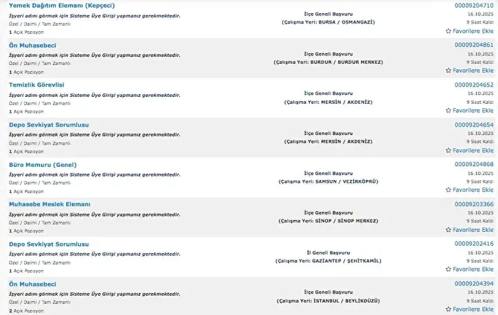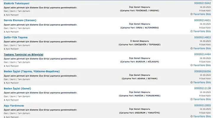 Türkiye İş Kurumu (İŞKUR), Ekim ayı için yeni personel alım ilanlarını yayımladı. Ülke genelinde hem kamu kurumlarına hem de özel sektöre yönelik binlerce iş fırsatı adayların başvurusuna açıldı. En az ortaokul mezunu adayların başvurabileceği ilanlar, İŞKUR’un e-şube portalı üzerinden görüntülenebiliyor. Adaylar, şehir, meslek veya kurum bazlı filtreleme yaparak kendilerine uygun iş ilanlarını kolayca bulabiliyor. İşte İŞKUR aracılığıyla yayımlanan güncel Ekim 2025 iş ilanları ve detayları.