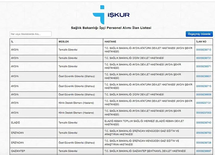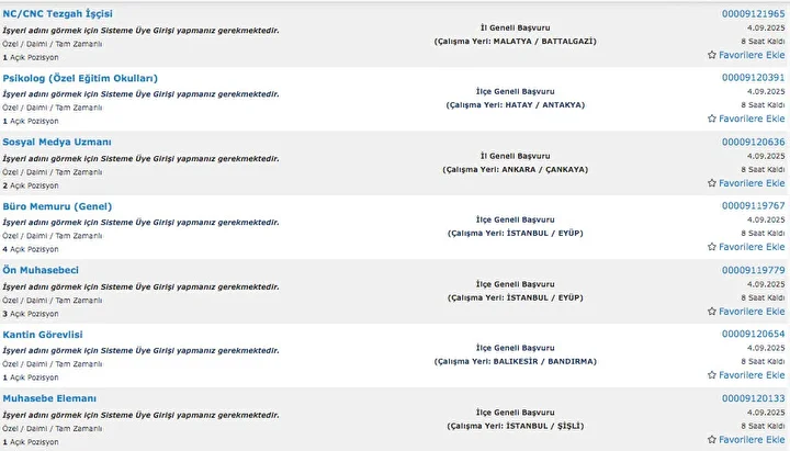 İŞKUR üzerinden her gün farklı sektörlerde binlerce iş ilanı yayımlanıyor. Güvenlik görevlisi, temizlik personeli, klinik destek elemanı, üretim ve paketleme elemanı ile şoför gibi birçok pozisyon için açık iş ilanları iş arayanlarla buluşturuluyor. Başvurular ise İŞKUR’un resmi internet sitesi ve il müdürlükleri aracılığıyla kolayca yapılabiliyor. İşte İŞKUR iş başvurusu ekranı güncel açık iş ilanları listesi.