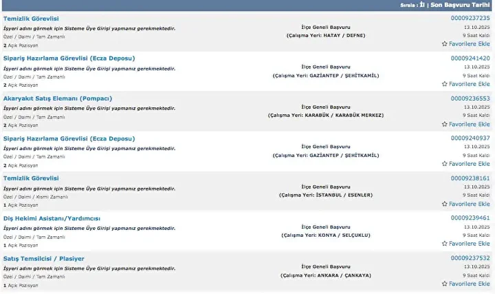 İŞKUR üzerinden her gün farklı sektörlerde binlerce iş ilanı yayımlanıyor. Güvenlik görevlisi, temizlik personeli, klinik destek elemanı, üretim ve paketleme elemanı ile şoför gibi birçok pozisyon için açık iş ilanları iş arayanlarla buluşturuluyor. Başvurular ise İŞKUR’un resmi internet sitesi ve il müdürlükleri aracılığıyla kolayca yapılabiliyor. İşte İŞKUR iş başvurusu ekranı güncel açık iş ilanları listesi.