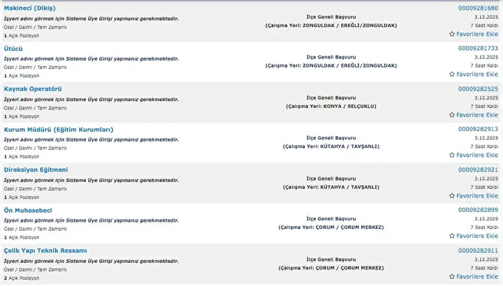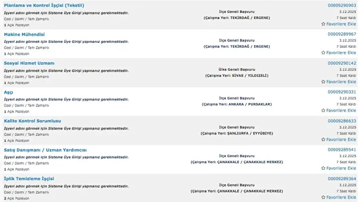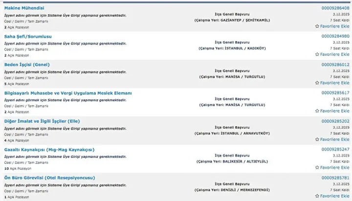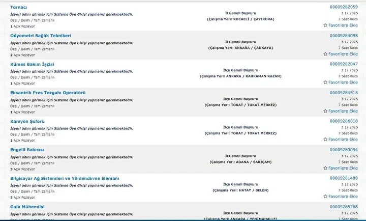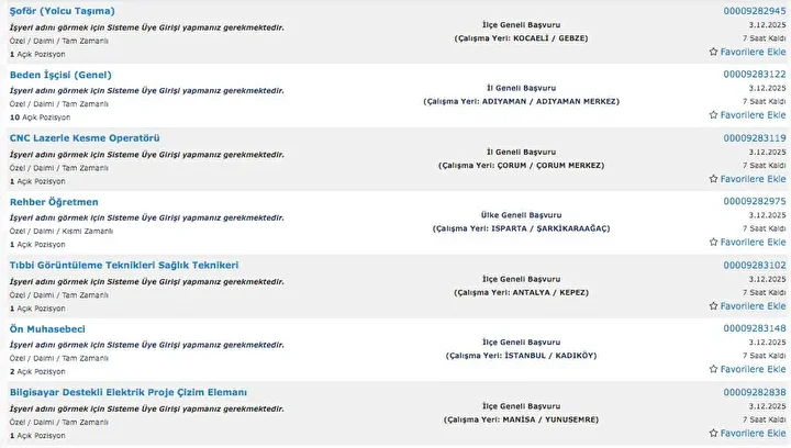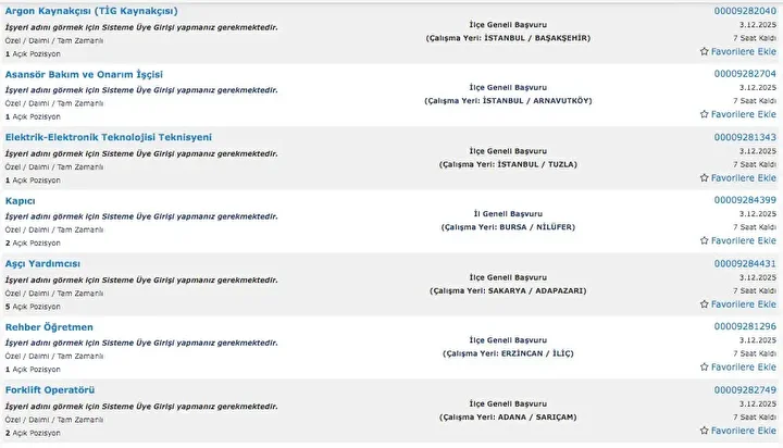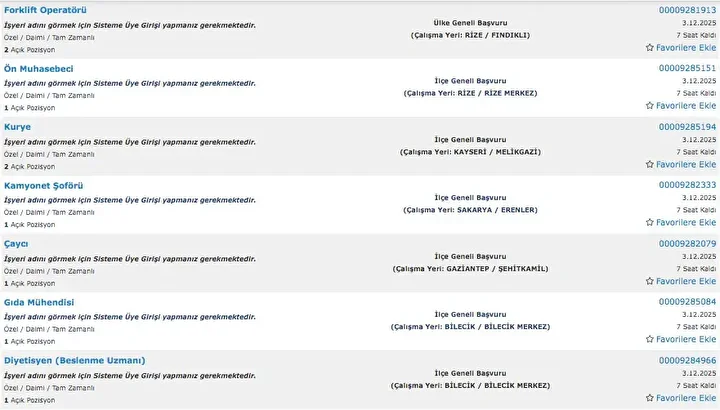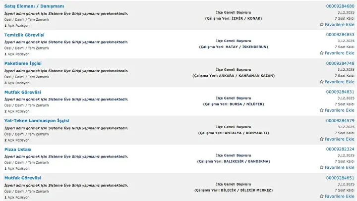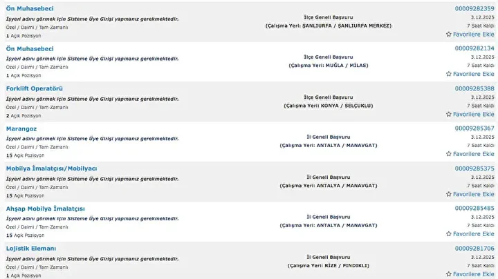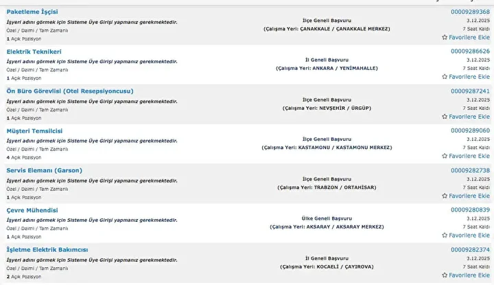 İŞKUR, aralık ayı güncel açık iş ilanlarını yayımlamaya devam ediyor. Türkiye İş Kurumu üzerinden sürekli işçi alımı, kurum dışı kamu ilanları ve özel sektör personel alımları yoğun ilgi görüyor. Hastanelere temizlik görevlisi, güvenlik görevlisi, şoför, ön muhasebeci, servis elemanı, büro personeli, üretim elemanı gibi birçok kadroda personel aranıyor. İş arayanlar, İŞKUR’un e-Şube platformu üzerinden şehir, pozisyon, öğrenim durumu ve deneyim kıstaslarına göre filtreleme yaparak kendilerine uygun ilanlara kolayca başvuru yapabiliyor. Aralık ayı itibarıyla yayımlanan Türkiye geneli güncel açık iş ilanları, istihdam fırsatlarını takip eden adaylar için önemli bir kaynak olmaya devam ediyor. İşte Aralık ayı Türkiye geneli güncel açık iş ilanları.