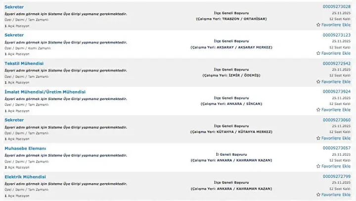 Türkiye İş Kurumu (İŞKUR) tarafından Kasım 2025 itibarıyla yenilenen açık iş ilanları yayımlandı; en az lise mezunu on binlerce aday için yeni istihdam kapıları aralanıyor. Kamu kurumlarından bakanlıklara, belediyelerden üniversitelere ve özel sektörün önde gelen firmalarına kadar geniş bir alanda güvenlik görevlisi, büro personeli, teknisyen, sağlık personeli, şoför, temizlik görevlisi ve üretim işçisi gibi çok sayıda unvanda personel alımı yapılıyor. İlanların önemli kısmında KPSS şartı aranmazken, bazı pozisyonlarda ise KPSS puanlı ve öncelikli başvuru kabul ediliyor. Başvurular ücretsiz olarak İŞKUR’un e-Devlet entegrasyonlu resmi internet sitesi ve mobil uygulaması üzerinden kolayca gerçekleştirilebiliyor. İşte İŞKUR’un Kasım ve Aralık ayı 2025 güncel iş ilanları ve personel alım fırsatları.