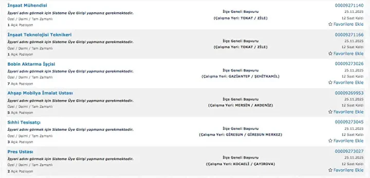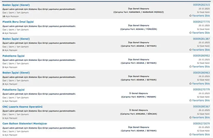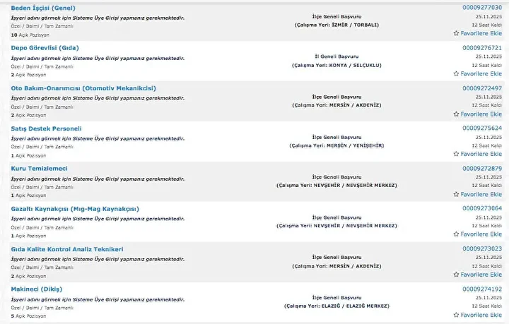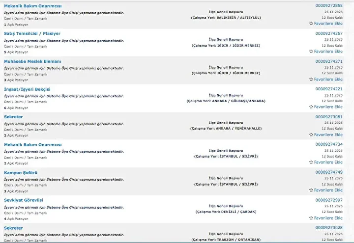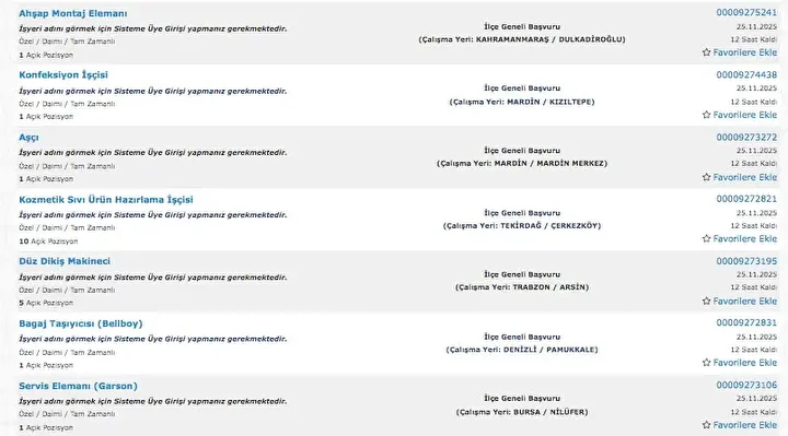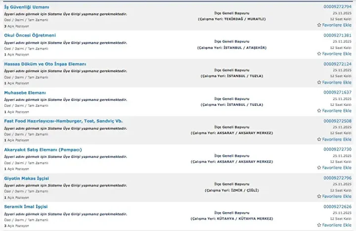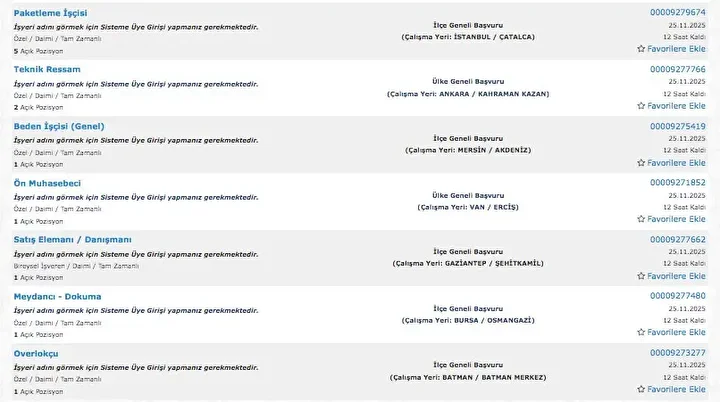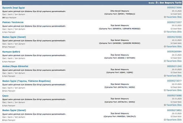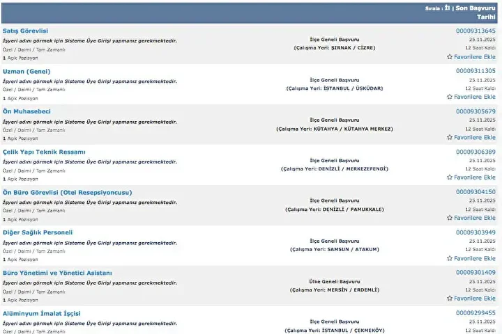İŞKUR üzerinden her gün farklı sektörlerde binlerce iş ilanı yayımlanıyor. Güvenlik görevlisi, temizlik personeli, klinik destek elemanı, üretim ve paketleme elemanı ile şoför gibi birçok pozisyon için açık iş ilanları iş arayanlarla buluşturuluyor. Başvurular ise İŞKUR’un resmi internet sitesi ve il müdürlükleri aracılığıyla kolayca yapılabiliyor. İşte İŞKUR iş başvurusu ekranı güncel açık iş ilanları listesi.