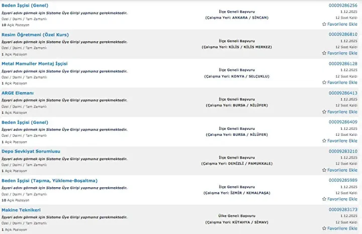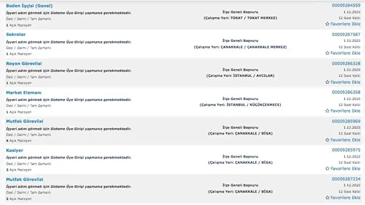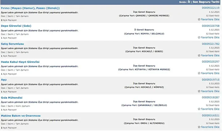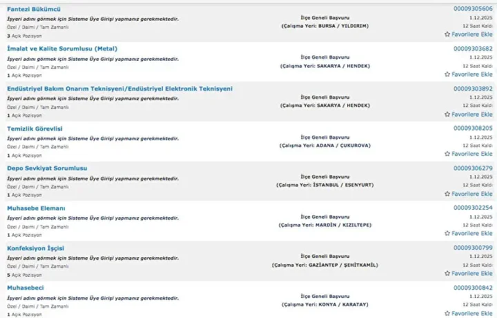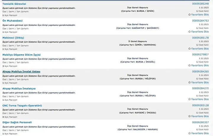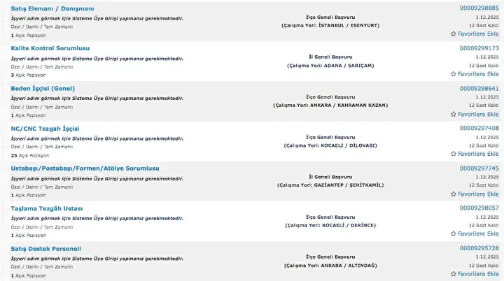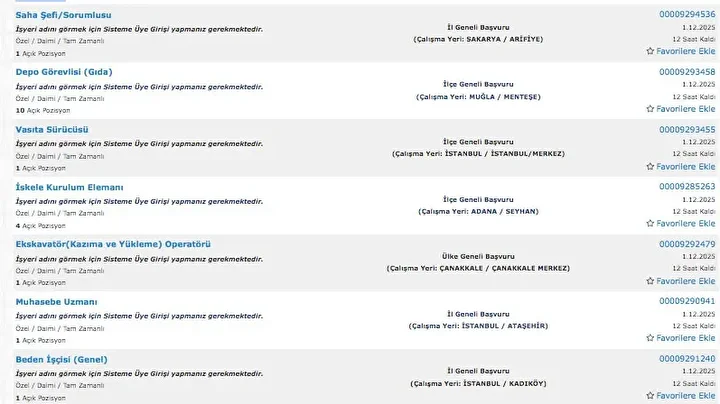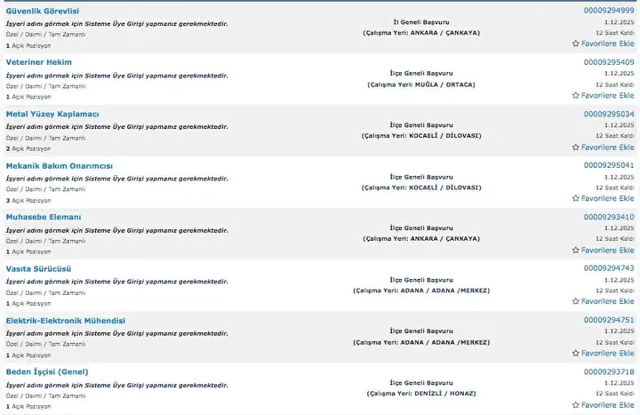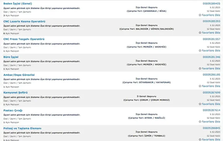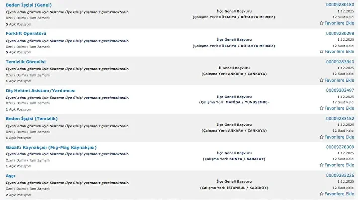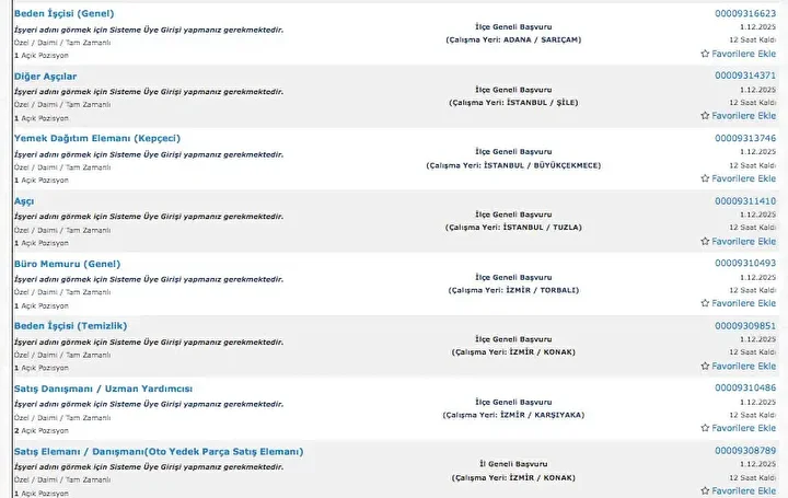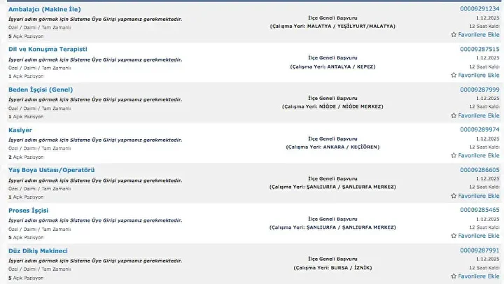 İŞKUR üzerinden her gün farklı sektörlerde binlerce iş ilanı yayımlanıyor. Güvenlik görevlisi, temizlik personeli, klinik destek elemanı, üretim ve paketleme elemanı ile şoför gibi birçok pozisyon için açık iş ilanları iş arayanlarla buluşturuluyor. Başvurular ise İŞKUR’un resmi internet sitesi ve il müdürlükleri aracılığıyla kolayca yapılabiliyor. İşte İŞKUR iş başvurusu ekranı güncel açık iş ilanları listesi.