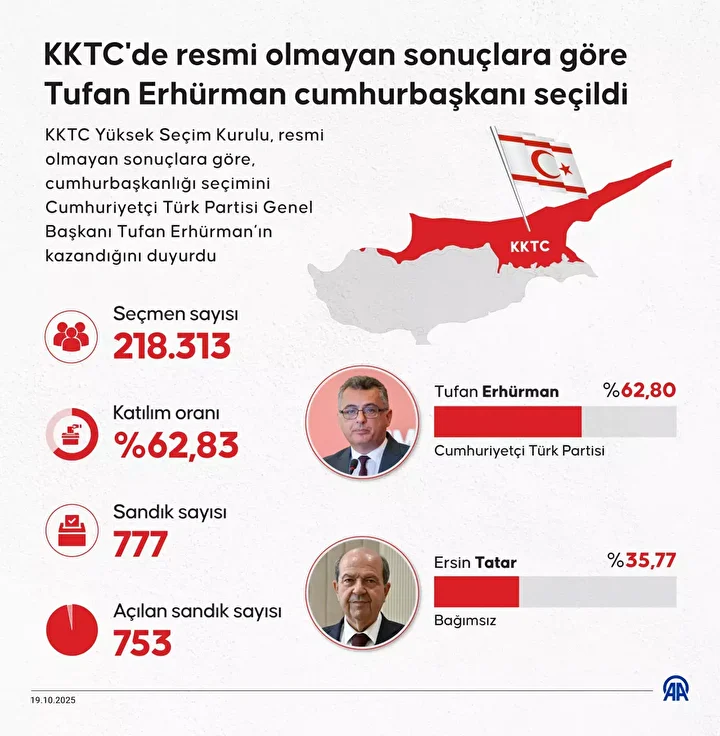KKTC Yüksek Seçim Kurulu, resmi olmayan sonuçlara göre, cumhurbaşkanlığı seçimini Cumhuriyetçi Türk Partisi Genel Başkanı Tufan Erhürman’ın kazandığını duyurdu.