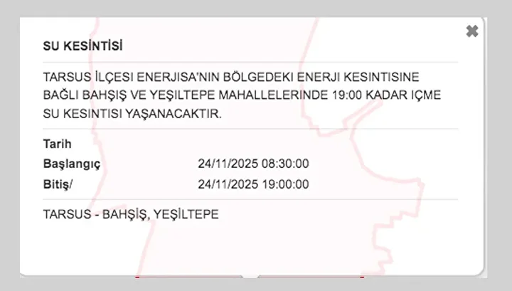 Mersin'de içme suyu hatlarında yaşanan arızalar ya da planlı bakım çalışmaları kapsamında bazı mahallelerde su kesintisi uygulanmaktadır. Bu kapsamda, 24 Kasım tarihine ait güncel su kesintisi listesi, etkilenen bölgeler ve suyun geleceği saatleri sizler için derledik. Mersin'de bugün Akdeniz, Tarsus ve Silifke'de su kesintileri yaşanacak. Peki MESKİ sular ne zaman gelecek? İşte Mersin planlı su yaşanacak mahalleler ve kesintisi bitiş saatleri.