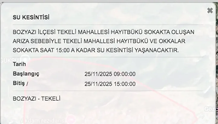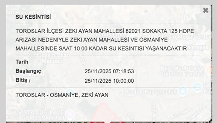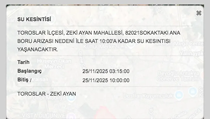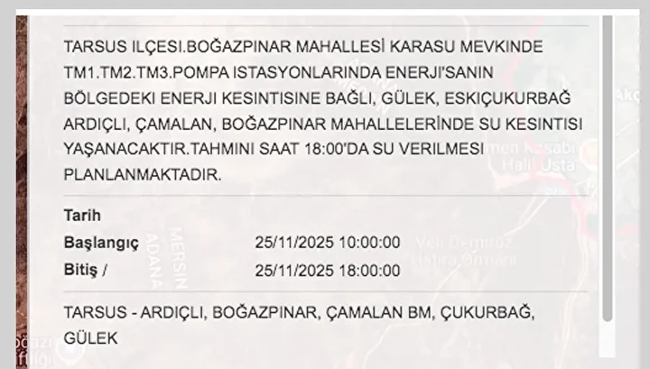 MESKİ su kesintisi, 25 Kasım 2025 Salı günü, Mersin'in Tarsus, Toroslar ve Bozyazı ilçelerinde altyapı yenileme ve şebeke arızası giderme çalışmaları nedeniyle belirli mahallelerde uygulanacak. Peki İşte MESKİ su kesintisi hangi mahallede olacak? 25 Kasım Mersin su kesintisi listesi.
