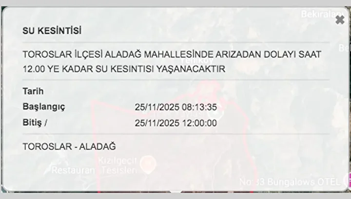 Mersin'de içme suyu hatlarında yaşanan arızalar ya da planlı bakım çalışmaları kapsamında bazı mahallelerde su kesintisi uygulanmaktadır. Bu kapsamda, 25 Kasım tarihine ait güncel su kesintisi listesi, etkilenen bölgeler ve suyun geleceği saatleri sizler için derledik. Mersin'de bugün Toroslar, Tarsus ve Bozyazı'a su kesintileri yaşanacak. Peki MESKİ sular ne zaman gelecek? İşte Mersin planlı su yaşanacak mahalleler ve kesintisi bitiş saatleri.