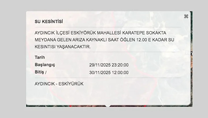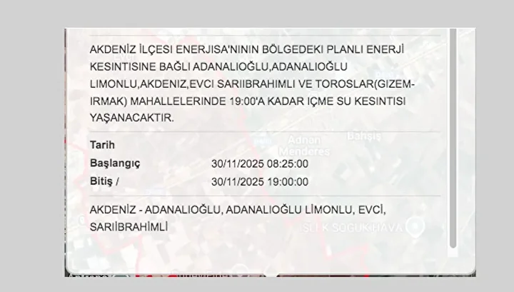 30 Kasım 2025 Pazar günü Mersin genelinde sabah saatlerinden itibaren başlayan geniş kapsamlı su kesintileri gün boyunca etkisini sürdürecek. MESKİ’den yapılan duyuruya göre planlı kesintilerin özellikle Aydıncık, Akdeniz ve Gülnar ilçelerinde yoğunlaşacağı bildirildi. Kentte yaşayan vatandaşlar 30 Kasım 2025 tarihli MESKİ su kesintisi sorgulama ekranını yakından takip ederek güncel durum ve arıza bilgilerine ulaşmaya çalışıyor. İşte Mersin’de bugünkü su kesintisinden etkilenecek mahalleler.