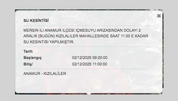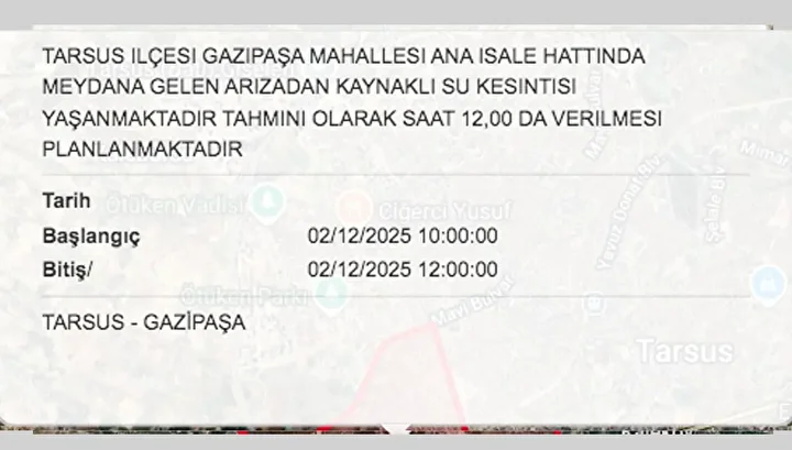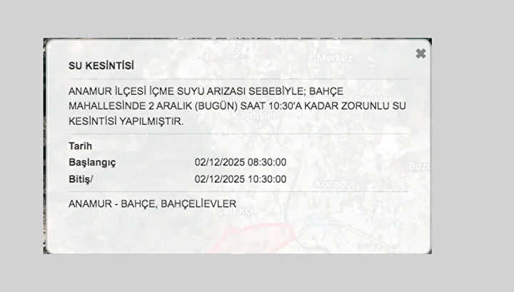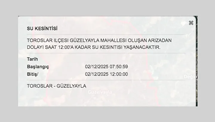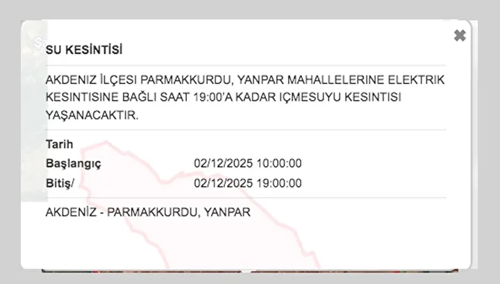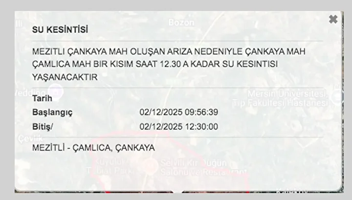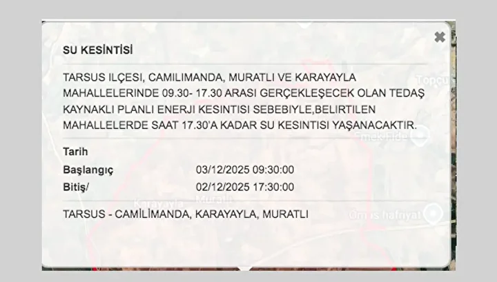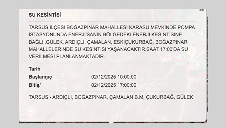 Mersin Su ve Kanalizasyon İdaresi Genel Müdürlüğü (MESKİ), bugün günü itibarıyla kent genelinde yaşanan planlı ve plansız su kesintilerine ilişkin güncel programı yayımladı. Mersin’in toplam 8 ilçesinde farklı mahallelerde su kesintisi uygulanacağı bildirildi. Bu kesintiler, bazı bölgelerde 8 saate kadar sürecek. Peki, hangi ilçe ve mahallelerde su kesintisi yaşanacak? İşte 2 Aralık 2025 tarihli MESKİ su kesintisi programı;