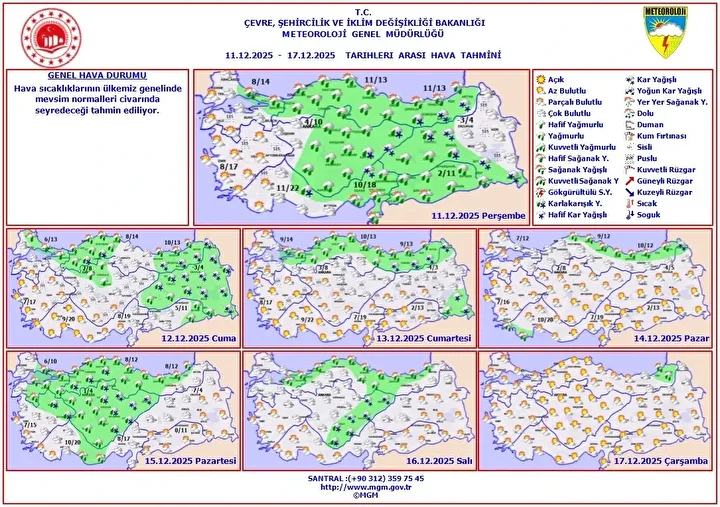 Meteoroloji Genel Müdürlüğü (MGM), ülkenin büyük kısmının, yağmur ve sağanak yağış, karla karışık yağmur ve kar, pus, sis ve buzlanma gibi hava olayları ile karşı karşıya kalacağını duyurdu. Sıcaklıkların mevsim normallerinde seyretmesi beklenirken, birçok ilde sağanak yağışların etkili olacağını, yarın için 13 ilde yer yer kar yağışlarının da etkisini hissettireceği belirtiliyor. Vatandaşların, özellikle sürücüler için, dikkatli olmaları gerektiği ifade ediliyor.