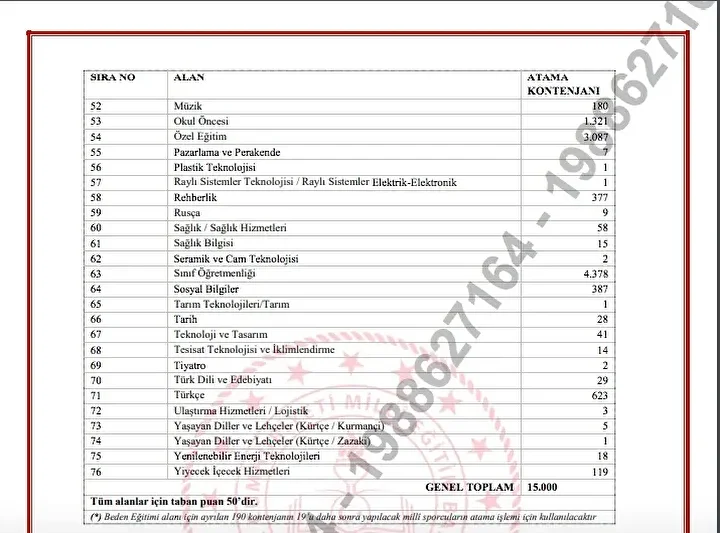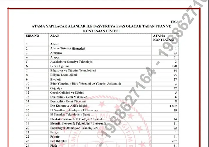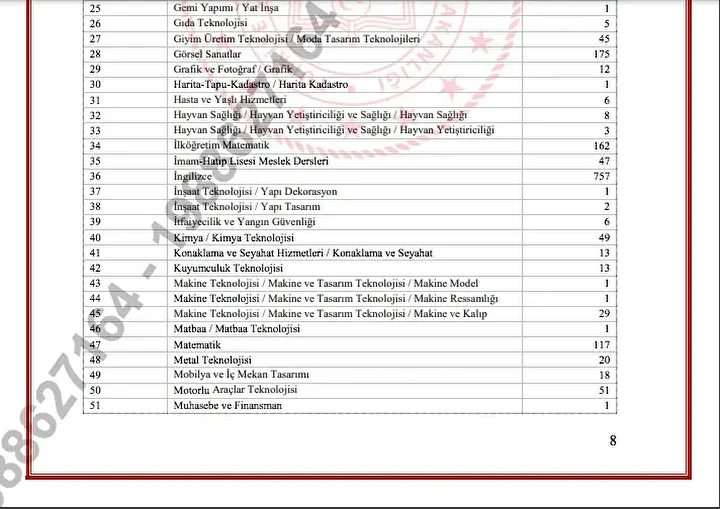 2025 atama planlamasında en fazla kontenjan ayrılan branşlar şöyle sıralandı: