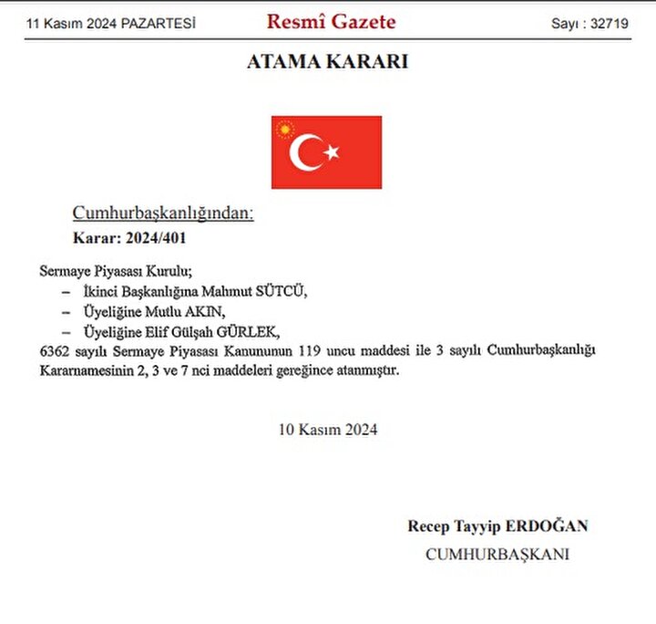 Kasım 2024 tarihli Resmi Gazete'de yayımlanan kararlarda, Sermaye Piyasası Kurulu'na bir süredir yapılması beklenen atamalar gerçekleşti. SPK İkinci Başkanlığına Mahmut Sütcü atandı. Resmi Gazete'de yayımlanan bu atama kararları listesi şu şekilde:
