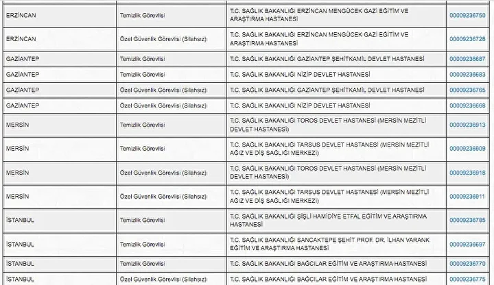Alımlar, ihtiyaç duyulan hizmet türlerine göre il düzeyinde yapılacak. Başvurularda, kişilerin Adrese Dayalı Nüfus Kayıt Sistemi'ndeki adresleri dikkate alınacak. Adaylar, ilan edilen kadrolardan yalnızca bir iş yeri ve mesleğe başvuru yapabilecek. Sürekli işçi kadrolarının meslek ve kadro sayısına göre dağılımlarına bakıldığında, 1948 temizlik görevlisi, 572 silahsız güvenlik görevlisi, 244 hastane klinik destek elemanı alınacak.