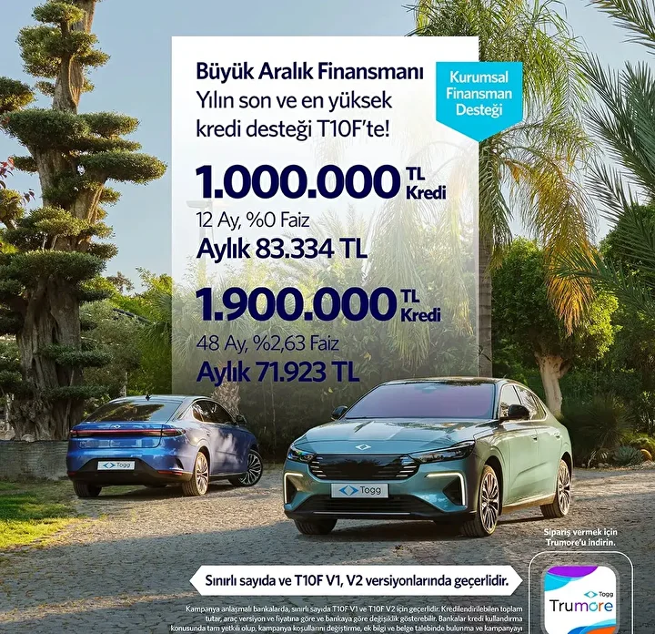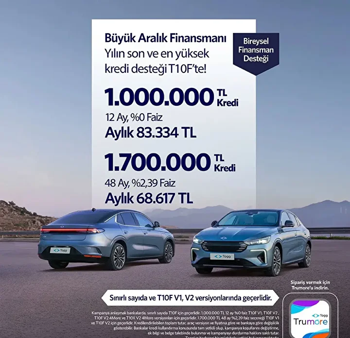 Togg, T10F modeli için 1 milyon TL tutarında 12 ay yüzde sıfır faizli, stoklarla sınırlı bir kredi kampanyasını duyurdu. Doğuştan elektrikli Togg'larda kampanyalar devam ediyor. Fiyat politikası ve kredi imkanlarıyla öne çıkan ve avantajlı duruma geçen Togg'ları tamamen kredili satışa sundu. Bireysel ve kurumsal alıcılar için yıl sonu kampanyası başlatan Togg, hem T10X hem de T10F'i kredi fırsatıyla satıyor.