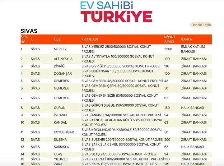 Yüzyılın konut projesi 500 bin sosyal konutun başvuruları 10 Kasım-19 Aralık 2025 tarihlerinde; Halkbank ve Emlak Katılım Bankaları üzerinden e-Devlet aracılığı ile yapılacak. TOKİ sosyal konut projesinde illere göre dağılımı belli oldu. TOKİ tarafından Sivas’ta yapılacak 3 bin 904 sosyal konutun ilçelere göre dağılımı şu şekilde olacak:
