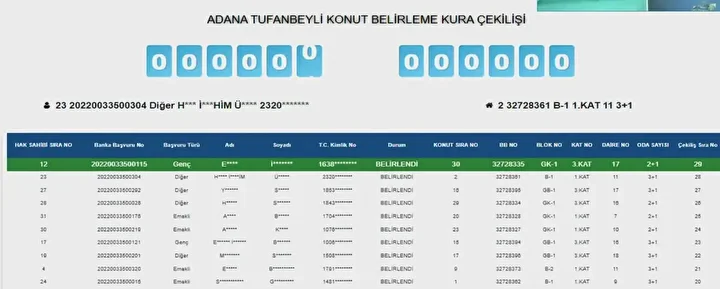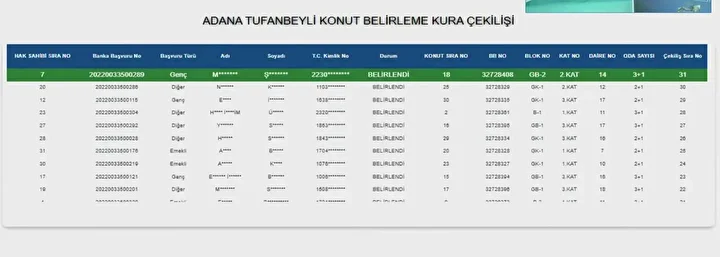 Çevre ve Şehircilik Bakanlığı Toplu Konut İdaresi Başkanlığı (TOKİ) tarafından 250.000 Sosyal Konut Projesi kapsamında başvuru toplanan Adana Tufanbeyli 156/250.000 Sosyal Konut Projesi asil hak sahipleri için; Adana Tufanbeyli Yenicami Mahallesi 214 Konut Projesi’nde inşa ettirilen; 2+1 nitelikli 15 adet ve 3+1 nitelikli 16 konut olmak üzere toplam 31 konut arasından konut belirleme kurası gerçekleştirildi. İşte TOKİ Adana sosyal konut belirleme kura sonuçları isim listesi.
