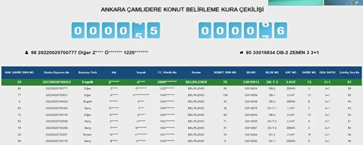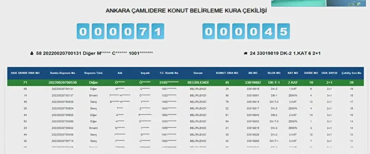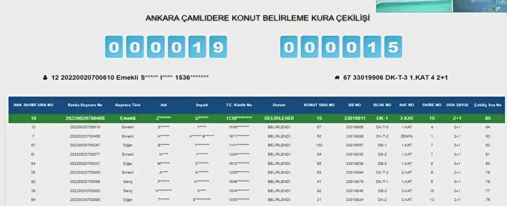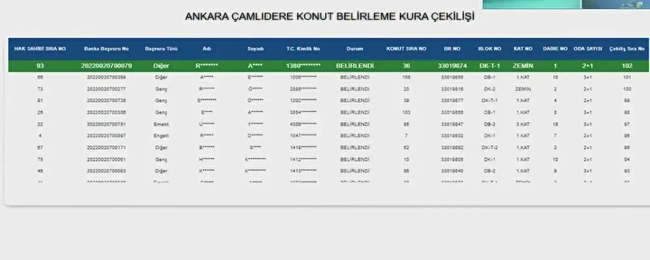 TOKİ Ankara Çamlıdere konut belirleme kura sonuçları ile hak sahiplerinin konutların yerleri belirlendi. Toplu Konut İdaresi Başkanlığı (TOKİ) tarafından 250 Bin Sosyal Konut Projesi kapsamında, Ankara Çamlıdere Konut Projesi’nde inşa ettirilen; 2+1 ve 3+1 nitelikli 113 konut için Konut Belirleme Kurası yapıldı. İşte TOKİ Ankara Çamlıdere sosyal konut belirleme kura sonuçları isim listesi.