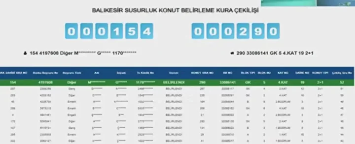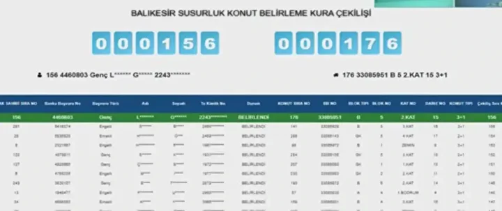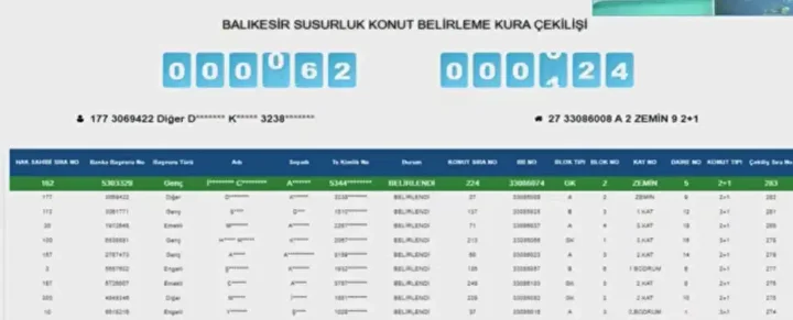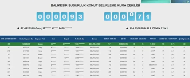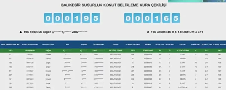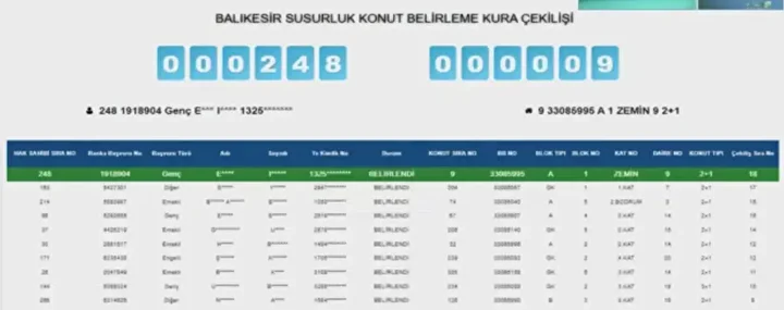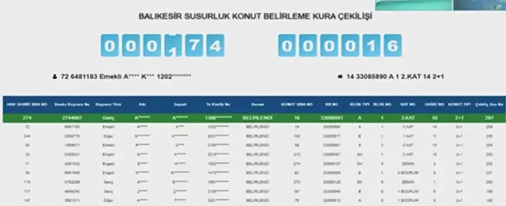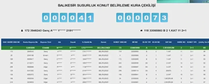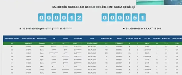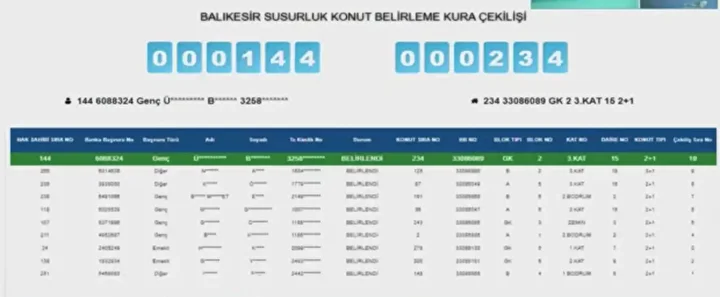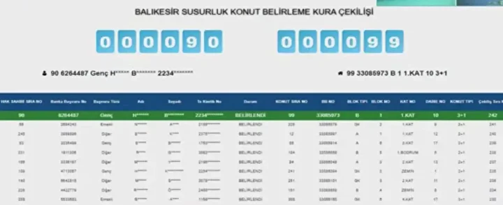 Çevre, Şehircilik ve İklim Değişikliği Bakanlığı Toplu Konut İdaresi Başkanlığı (TOKİ) tarafından 250.000 Sosyal Konut Projesi kapsamında başvuru toplanan Balıkesir Susurluk Sultaniye Mah. 309/250000 Sosyal Konut Projesi hak sahipleri için; Söz konusu proje kapsamında inşa ettirilen; 2+1 nitelikli 237 adet; 3+1 nitelikli 72 adet olmak üzere toplamda 309 adet konut için kura çekildi. İşte TOKİ Balıkesir Susurluk sosyal konut belirleme kura sonuçları isim listesi.