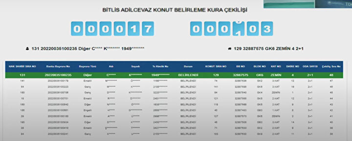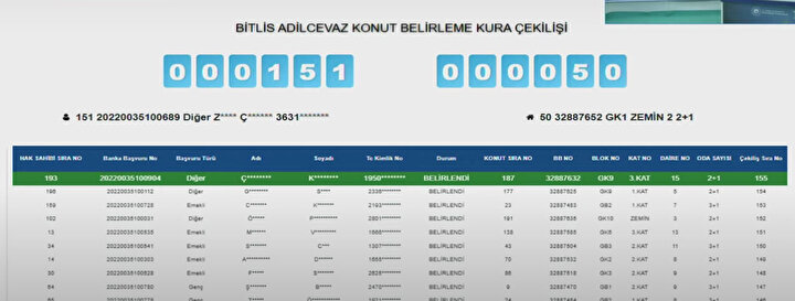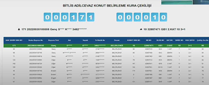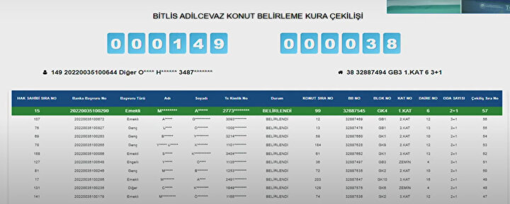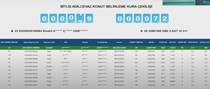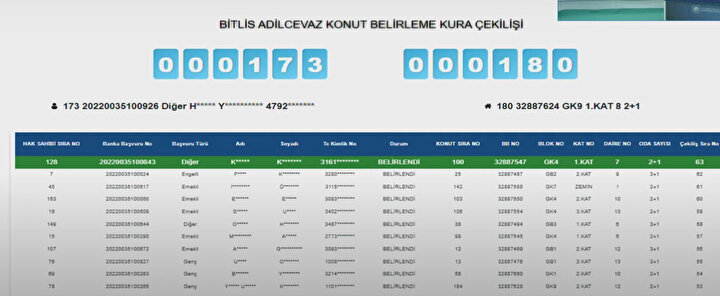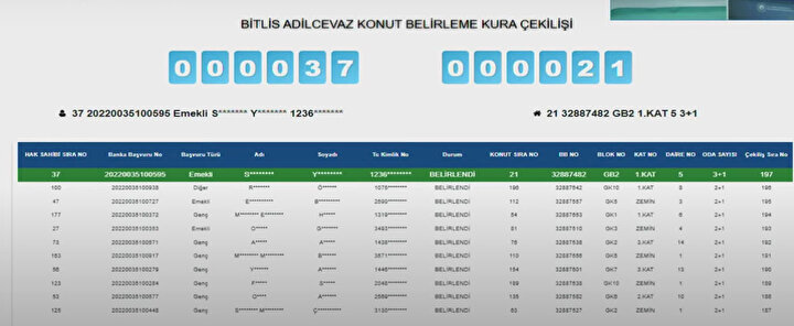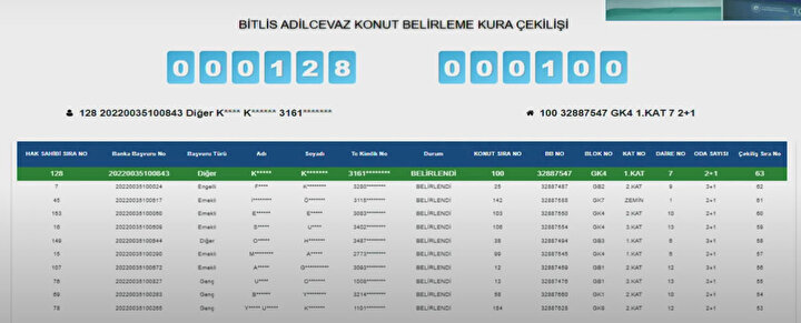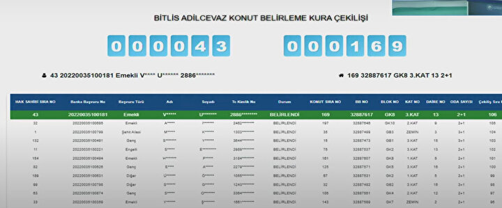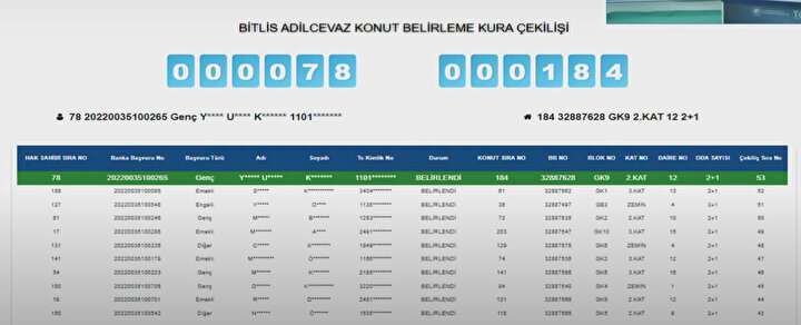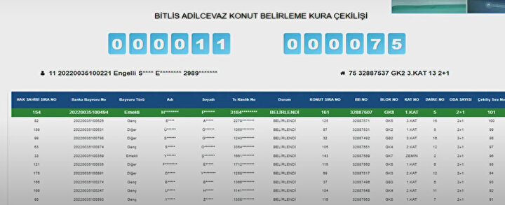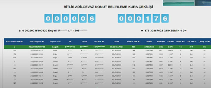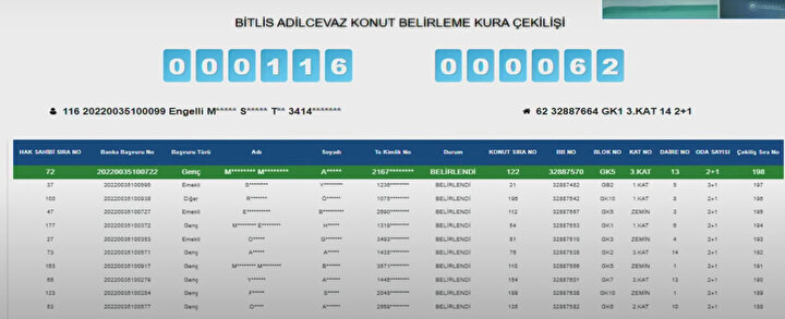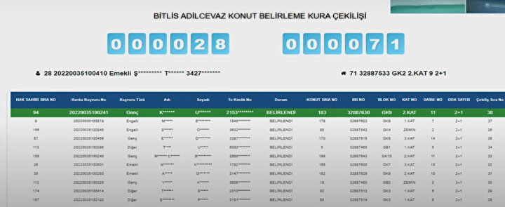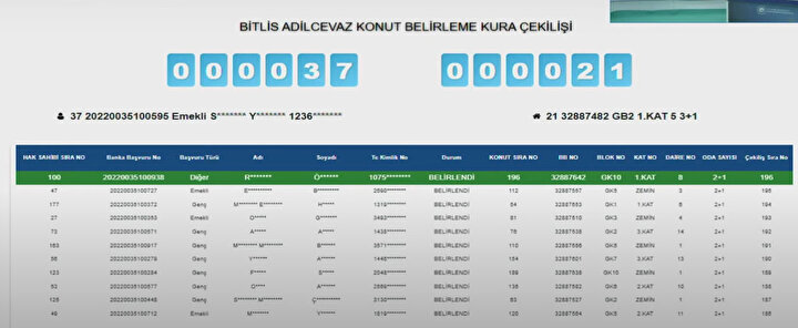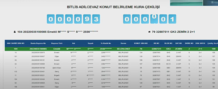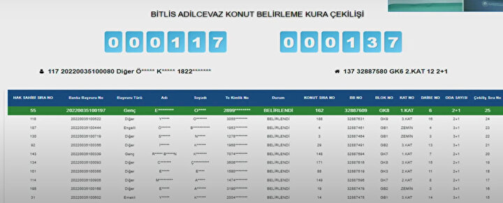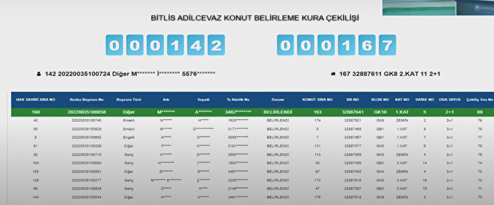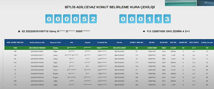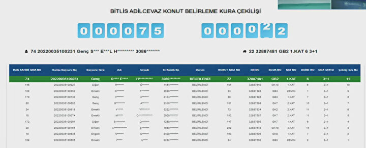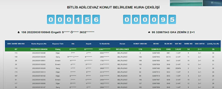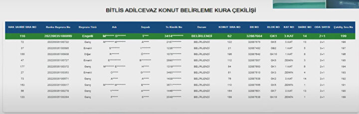 TOKİ tarafından yürütülen 250.000 Sosyal Konut Projesi kapsamında, Bitlis Adilcevaz'da ailelerin ev sahibi olma hayali gerçeğe dönüşüyor. Başvuruları daha önce toplanan Bitlis Adilcevaz 200/250000 Sosyal Konut Projesi hak sahipleri için Konut Belirleme Kurası gerçekleştirildi. Toplam 204 adet konut sahiplerine teslim edildi. Bu konutların 156 adedi 2+1 niteliğinde, 48 adedi ise 3+1 niteliğinde olacak şekilde projelendirildi. İşte Adilcevaz Alacaatlı Mahallesi 2+1 ve 3+1 konut belirleme kura sonuçları isim listesi sorgulama ekranı.