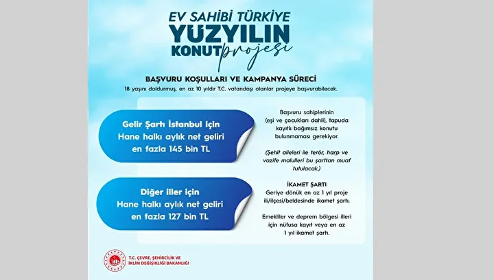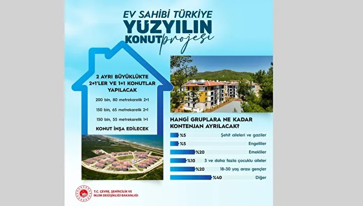Çevre, Şehircilik ve İklim Değişikliği Bakanlığı, Cumhurbaşkanı Recep Tayyip Erdoğan’ın açıkladığı 81 ili kapsayan “Yüzyılın Konut Projesi” ile Türkiye tarihinin en büyük sosyal konut adımını hayata geçiriyor. Proje ile vatandaşlar uygun fiyat ve 240 aya kadar taksit imkanıyla ev sahibi olma imkanına kavuşurken ülke genelinde de afet riskine karşı güvenli konutlar inşa edilecek. Aynı proje kapsamında İstanbul’daki fahiş kira artışlarını dengelemek, vatandaşların kiralık konuta uygun fiyatlarla erişimini kolaylaştırmak için TOKİ eliyle ilk kez kiralık sosyal konut uygulaması da hayata geçirilecek.