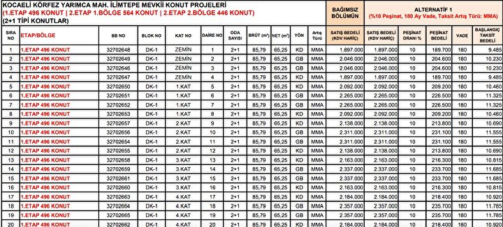 TOKİ tarafından 100 bin sosyal konut projesi kapsamında Kocaeli Körfez Yarımca Mahallesi 1. Etap 496, 2.Etap 1.Bölge 564 Konut Projesi ve 2.Etap 2. Bölge 446 Konut Projesi kapsamında yer alan; 2+1 konut tipinden 1.041 adet ve 3+1 konut tipinden 465 adet olmak üzere toplam 1.506 adet konut için konut belirleme kurası çekiliyor. İşte TOKİ Kocaeli Körfez Yarımca Mahallesi İlimtepe Mevkii konut belirleme kura sonuçları isim listesi.