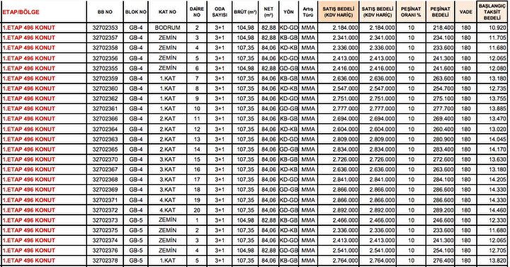 Hak sahiplerine konutlar, başvuru bedeli düşüldükten sonra kalan tutar; %10 peşin ve 180 ay vade ile taksitlendirilecek olup, peşinat sözleşme imzalama aşamasında tahsil edilecektir.
