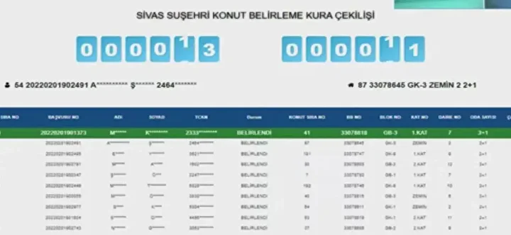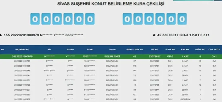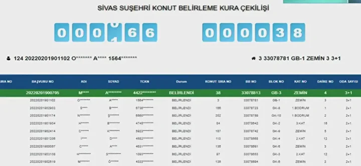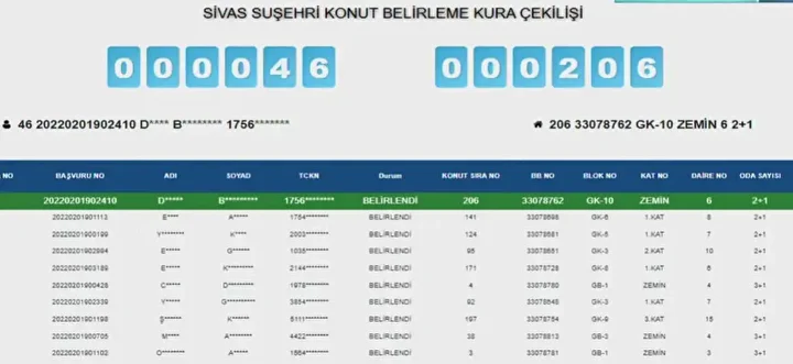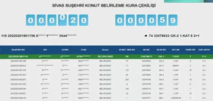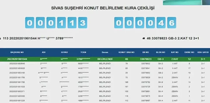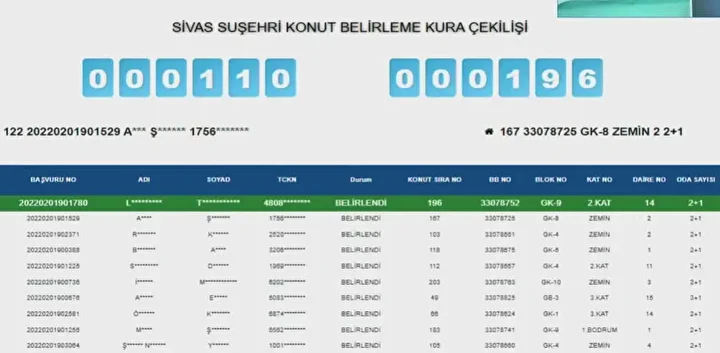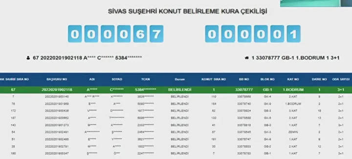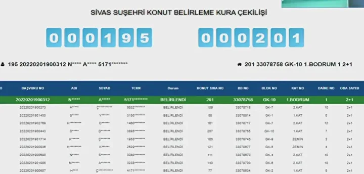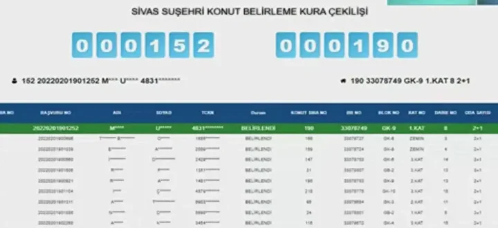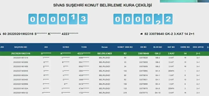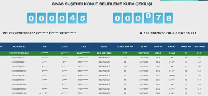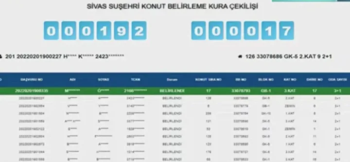 TOKİ Sivas sosyal konut belirleme kurası çekildi. Sivas Suşehri Yalnızbağlar Mahallesi 200 / 250 Bin Sosyal Konut Projesi kapsamında (2+1) 166 adet konut ve (3+1) 52 adet konut olmak üzere toplam 218 adet konut için, başvuruda bulunan 204 adet hak sahibi için konut belirleme kurası çekildi. İşte TOKİ Sivas Suşehri sosyal konut kura sonuçları isim listesi.